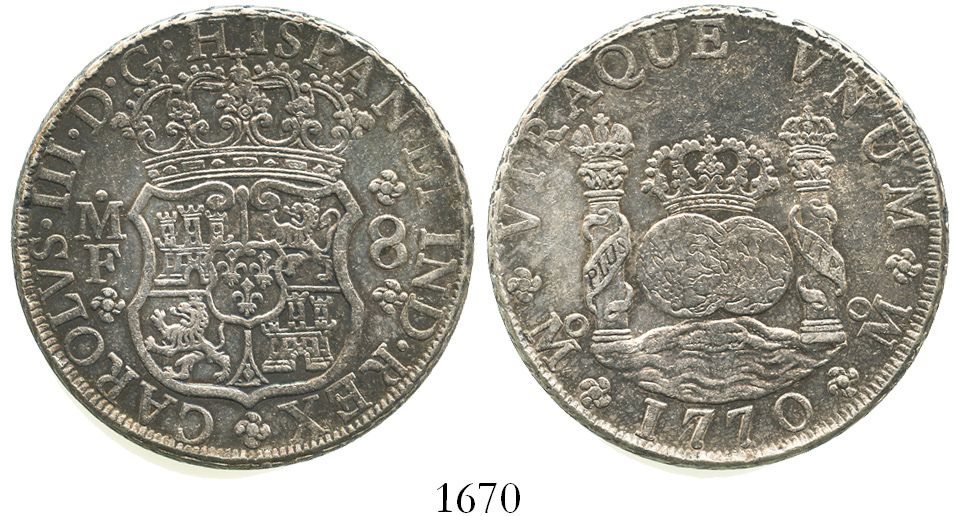 Mexico City, Mexico, pillar 8 reales, Charles III, 1770MF. KM-105; CT-910. 27.0 grams. Attractively toned AU-, parts of the rims slightly crude but overall a very nice example.
