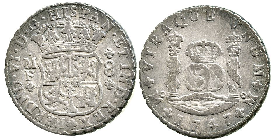 Mexico City, Mexico, pillar 8 reales, Ferdinand VI, 1747MF.