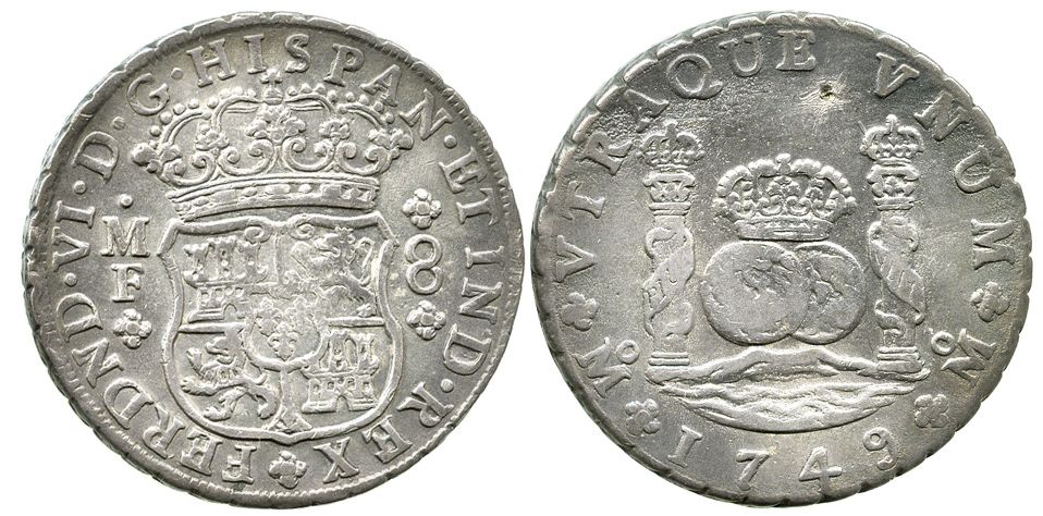 Mexico City, Mexico, pillar 8 reales, Ferdinand VI, 1749MF.