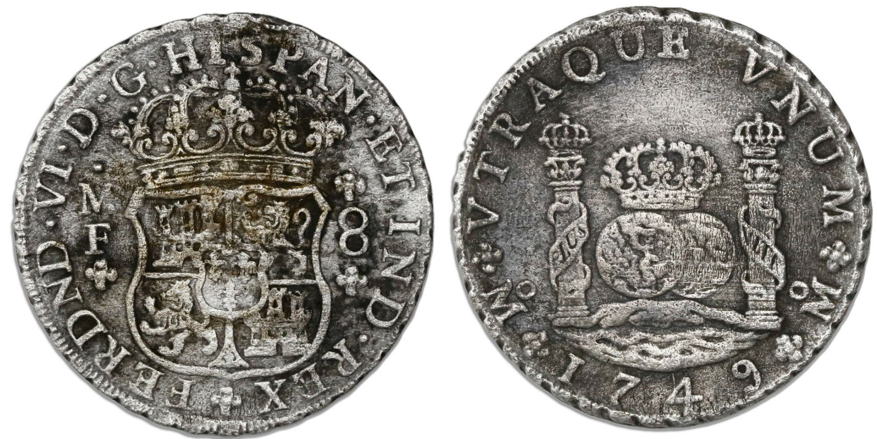 Mexico City, Mexico, pillar 8 reales, Ferdinand VI, 1749MF. KM-104.1; CT-324. 25.36 grams. VF+ details with nice light toning, minimal surface corrosion. With original (generic) certificate from the salvagers. Recovered from: Auguste, sunk in 1761 off Nova Scotia, Canada