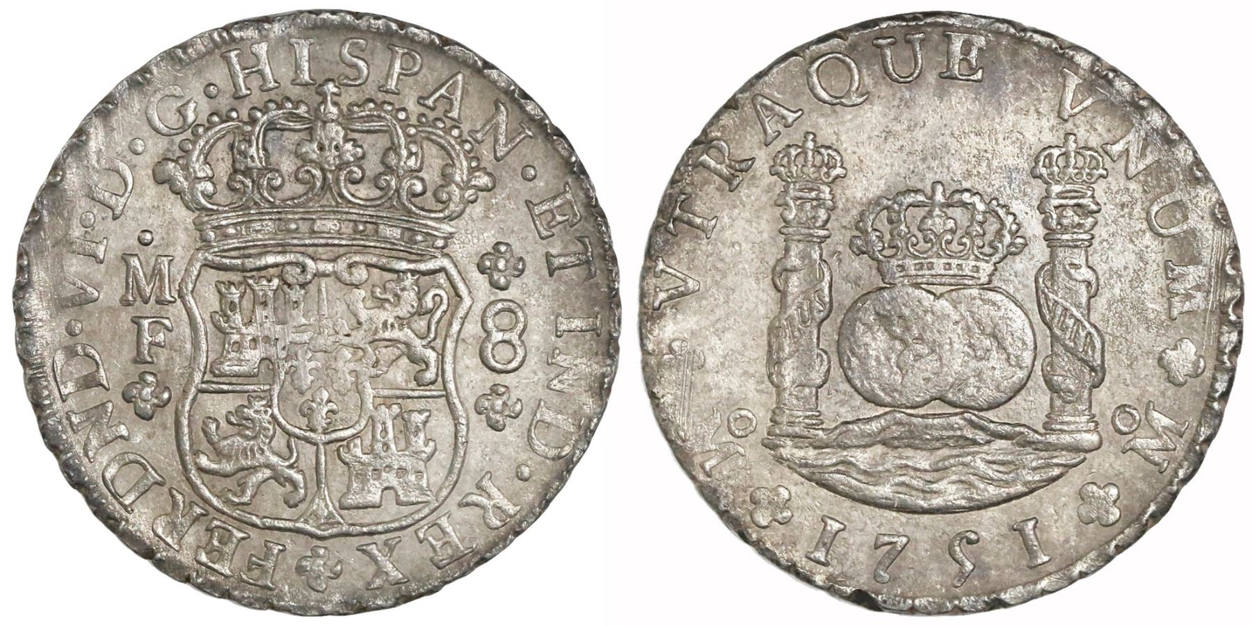 Mexico City, Mexico, pillar 8 reales, Ferdinand VI, 1751MF.