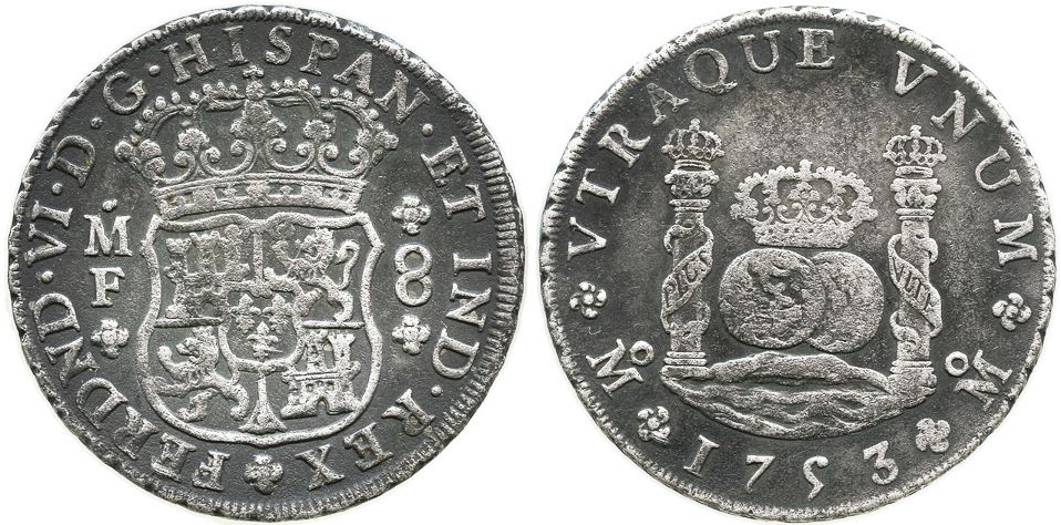 Mexico City, Mexico, pillar 8 reales, Ferdinand VI, 1753MF.
