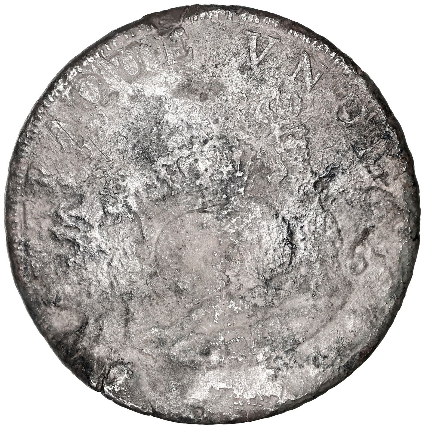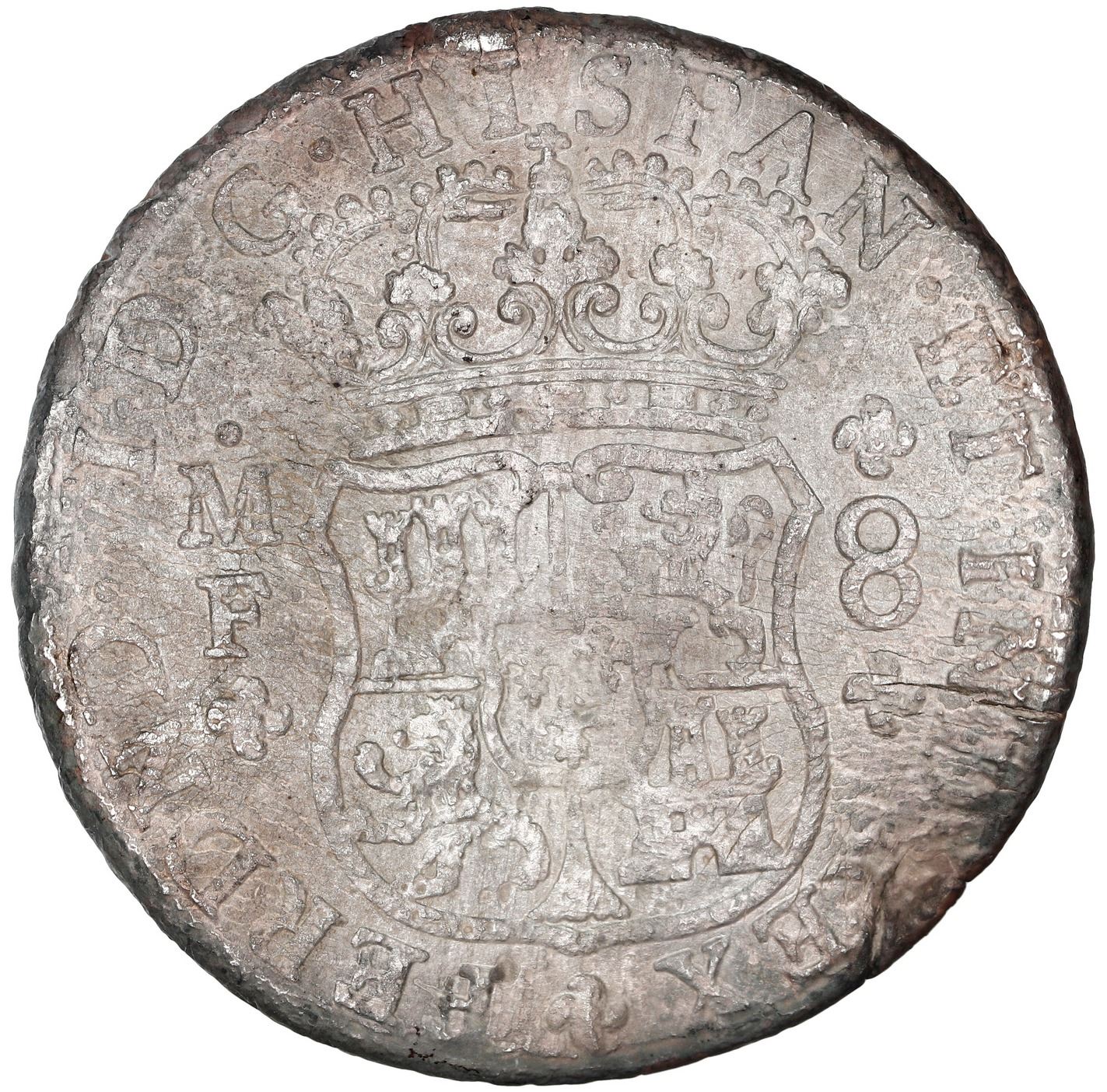 Mexico City, Mexico, pillar 8 reales, Ferdinand VI, 1754 MF, dissimilar crowns. Yonaka-M8-54c; KM-104.2; Cal-485. 22.09 grams. Bent and corroded yet plenty of detail remaining particularly on the obverse, scarce variety and scarce provenance with desirable original certification. With original certificate 298 from the salvagers (personally countersigned by Pierre Leclerc). Recovered from: Tilbury, sunk in 1757 off Nova Scotia, Canada.