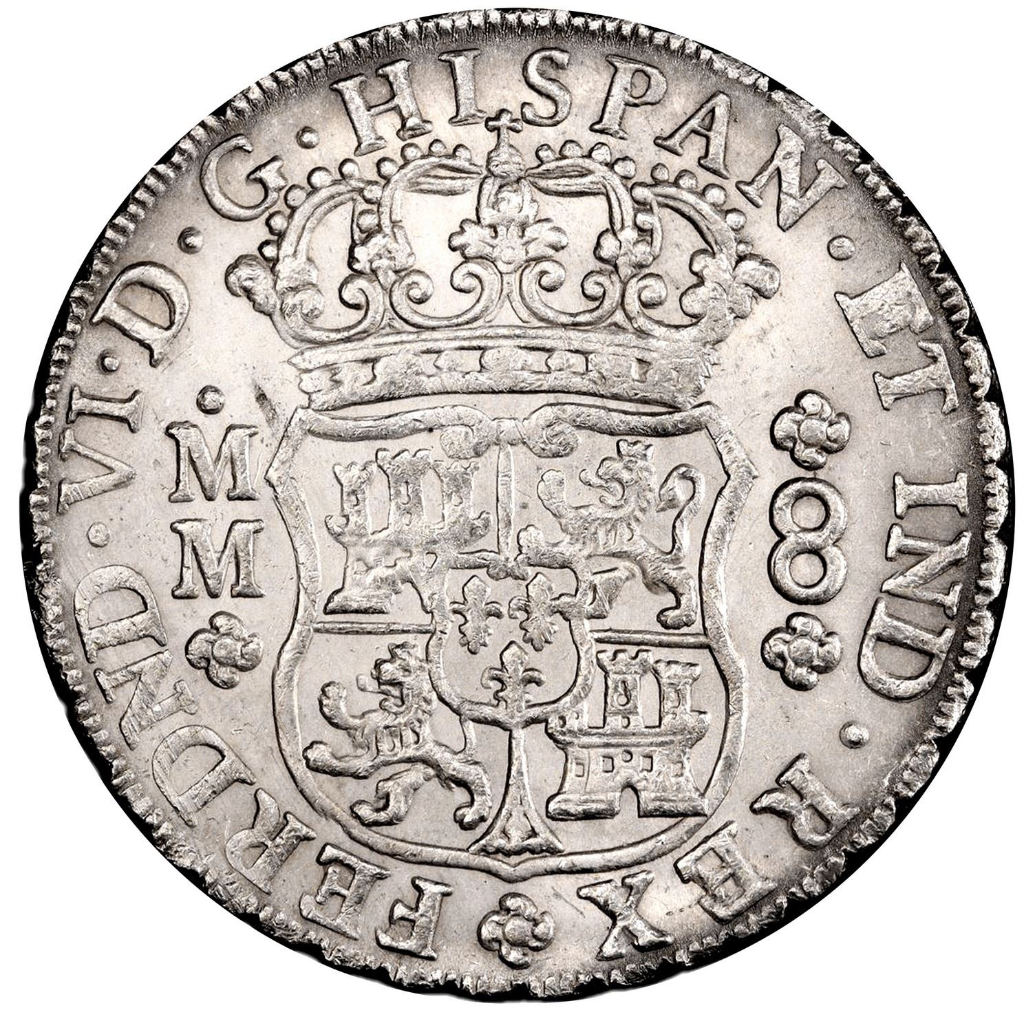 Mexico City, Mexico, pillar 8 reales, Ferdinand VI, 1754 MM/F, dissimilar crowns, PCGS MS61. Yonaka-M8.54d1; Cal-486; KM-104.1; Cal-483. Bold strike with very light adjustment marks on shield side, frosty white as non-toned with pristine fields, uncommon variety with lower assayer M punched over previous F (not noted by PCGS).