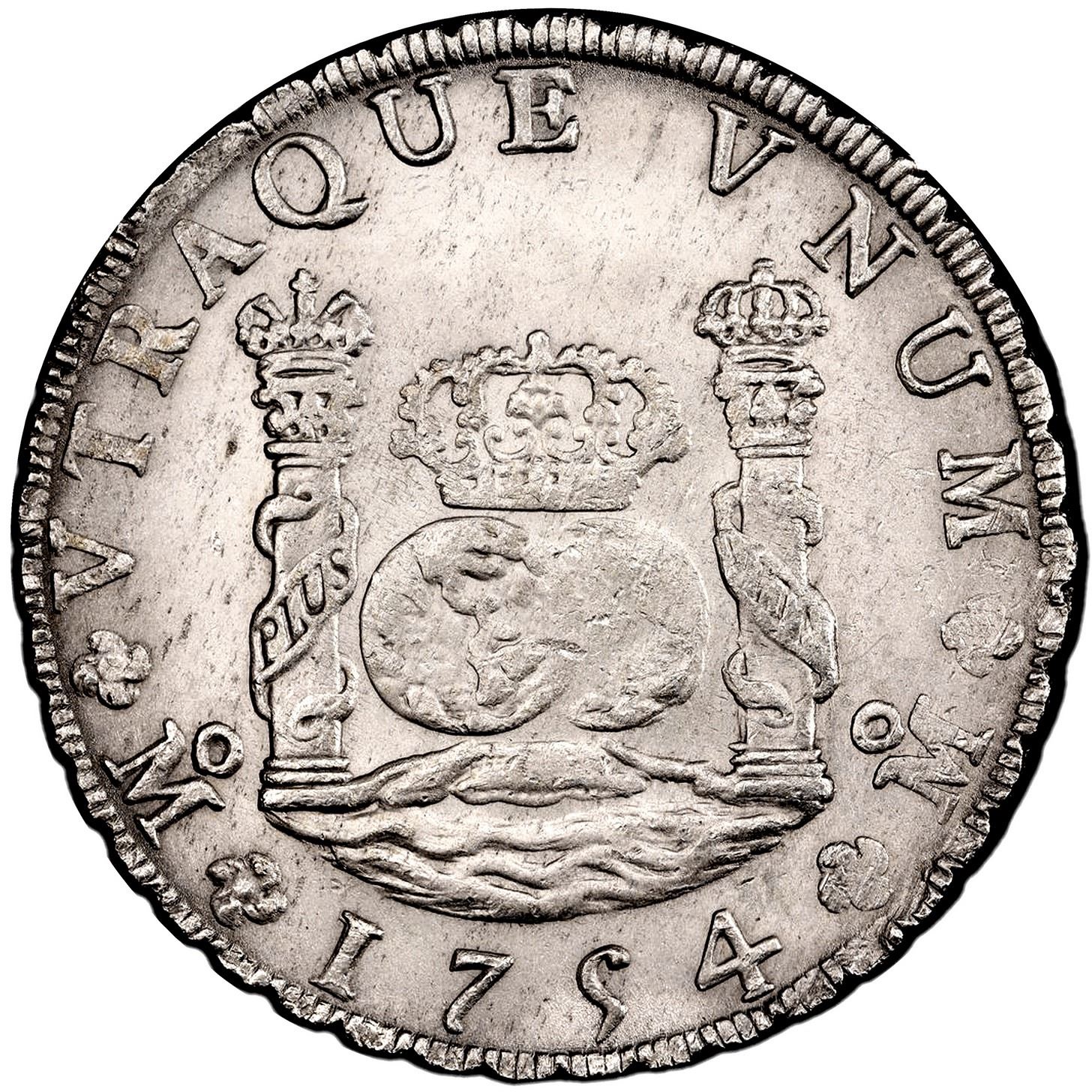 Mexico City, Mexico, pillar 8 reales, Ferdinand VI, 1754 MM/F, dissimilar crowns, PCGS MS61.