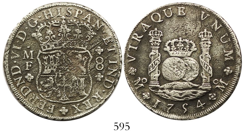 Mexico City, Mexico, pillar 8 reales, Ferdinand VI, 1754MF, both royal crowns, rare.