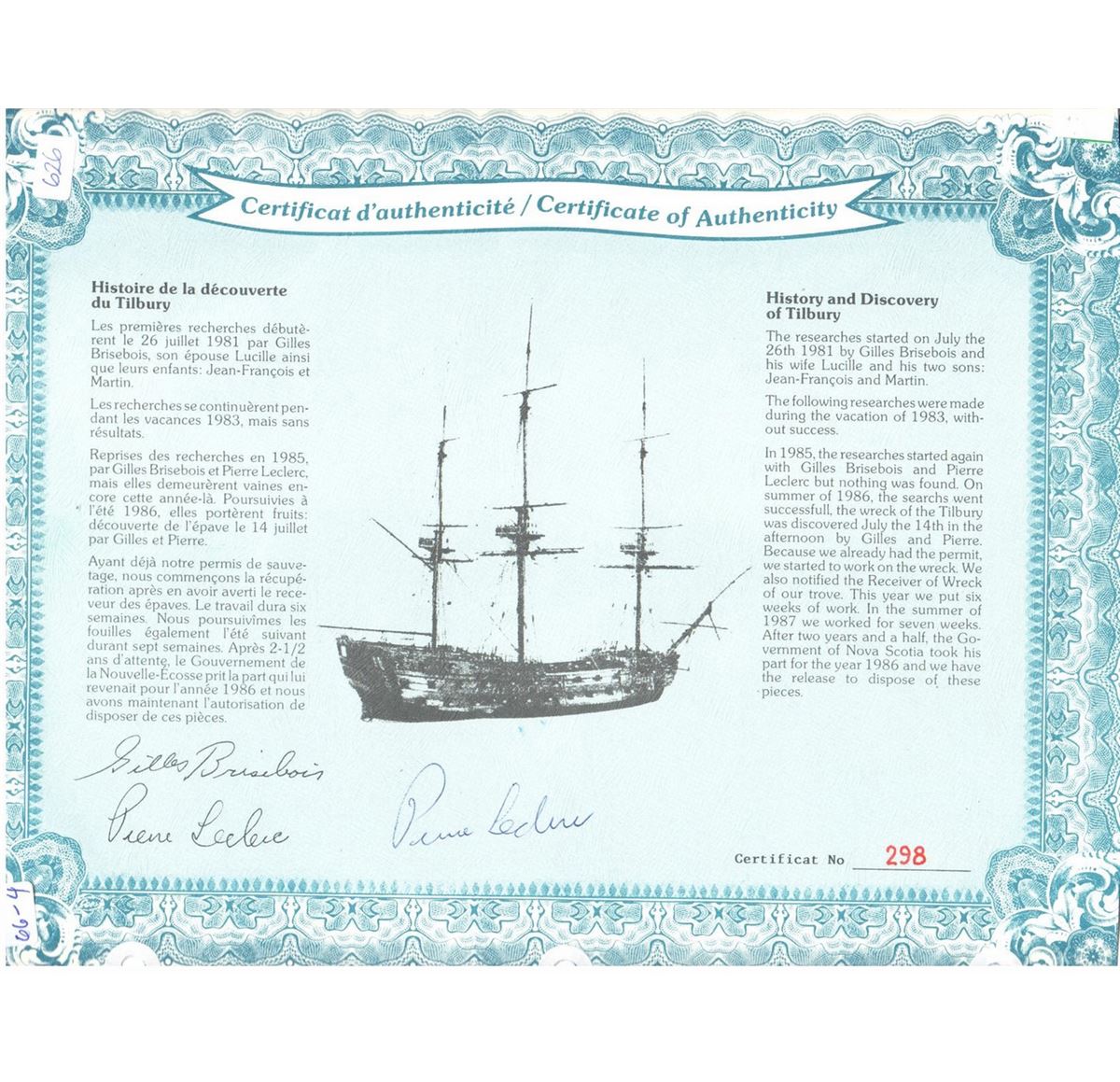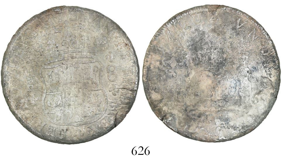 Mexico City, Mexico, pillar 8 reales, Ferdinand VI, 1754MF, unalike crowns, rare provenance and certificate. KM-104.2; CT-335. 22.09 grams. Near-XF details but very low contrast and with pillars-side surface moderately corroded, somewhat bent from salvage. With original certificate #298 from the salvagers (hand-signed by Pierre Leclerc). Recovered from: Tilbury, sunk in 1757 off Nova Scotia, Canada