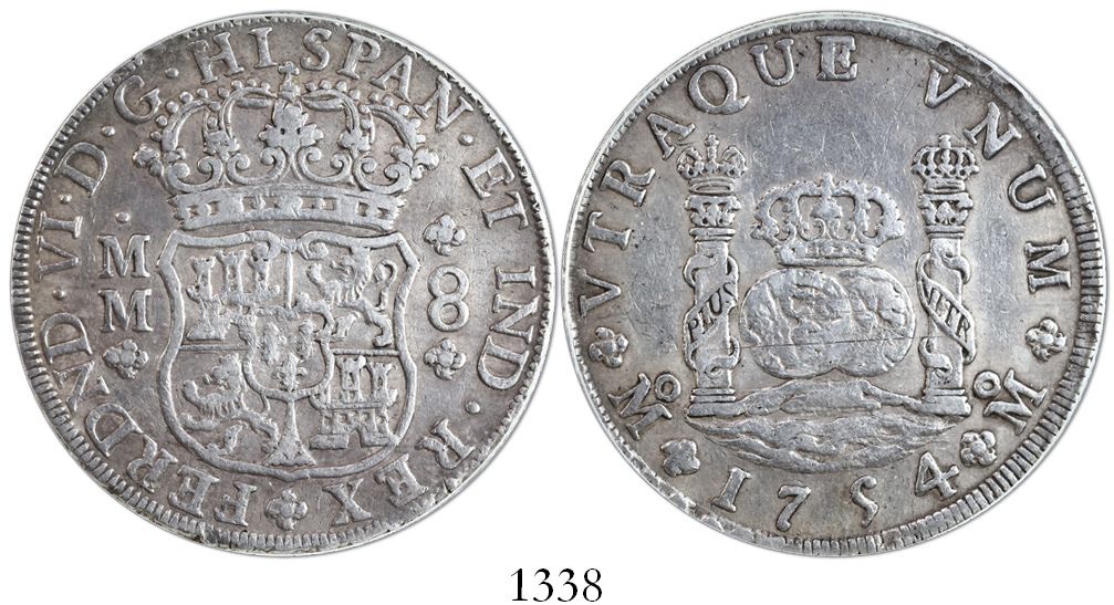 Mexico City, Mexico, pillar 8 reales, Ferdinand VI, 1754MM, encapsulated PCGS AU50. KM-104.1; CT-334. Bold strike, lightly toned, light adjustment marks in centers.
