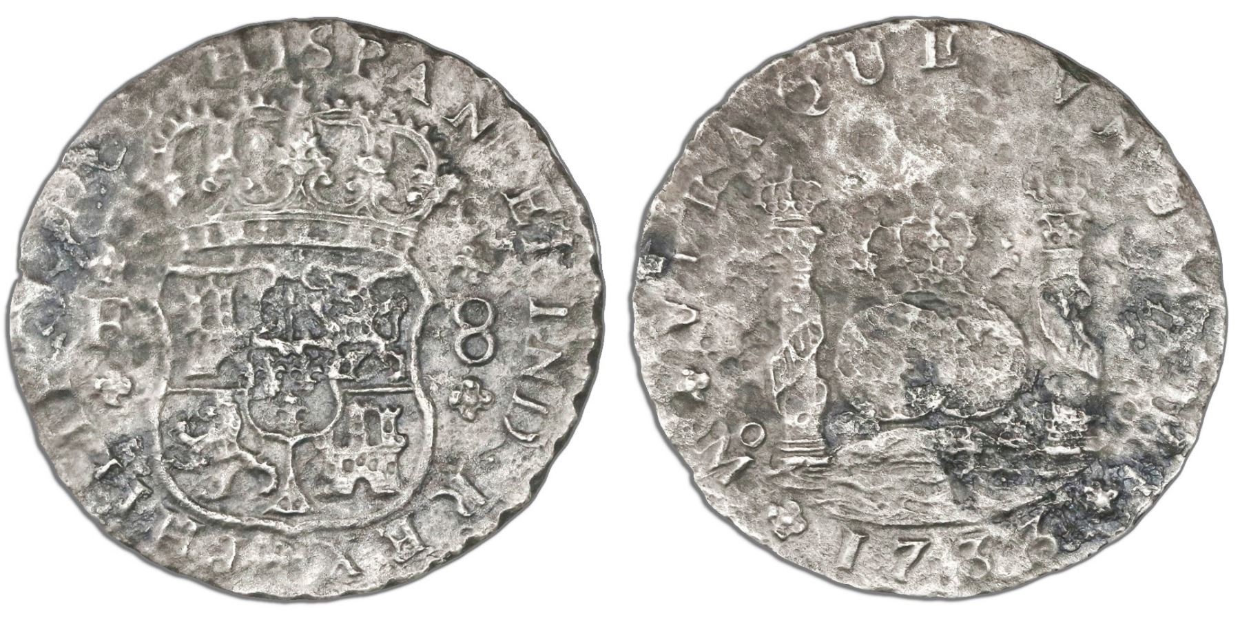 Mexico City, Mexico, pillar 8 reales, Philip V, 1733F. KM-103; CT-775. 18.69 grams. Heavily corroded but with all details still clear, particularly the date and mintmark, spotty toning. Pedigreed to the Ponterio auction of May 1988, with original lot-tag #360. Recovered from: Hollandia, sunk in 1743 off the Isles of Scilly, southwest of England