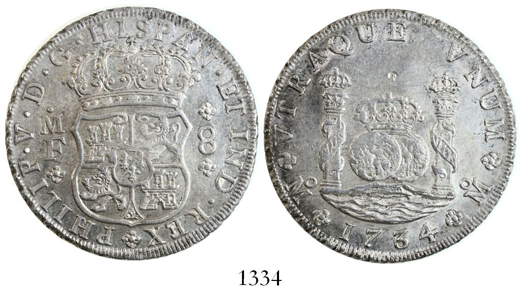 Mexico City, Mexico, pillar 8 reales, Philip V, 1734/3MF. KM-103; CT-777. 26.85 grams. Lustrous, non-toned Mint State with tiny chopmark (just one) in field above crowned globes, impressively flashy and a far cry from common "UNC details" salvaged specimens.