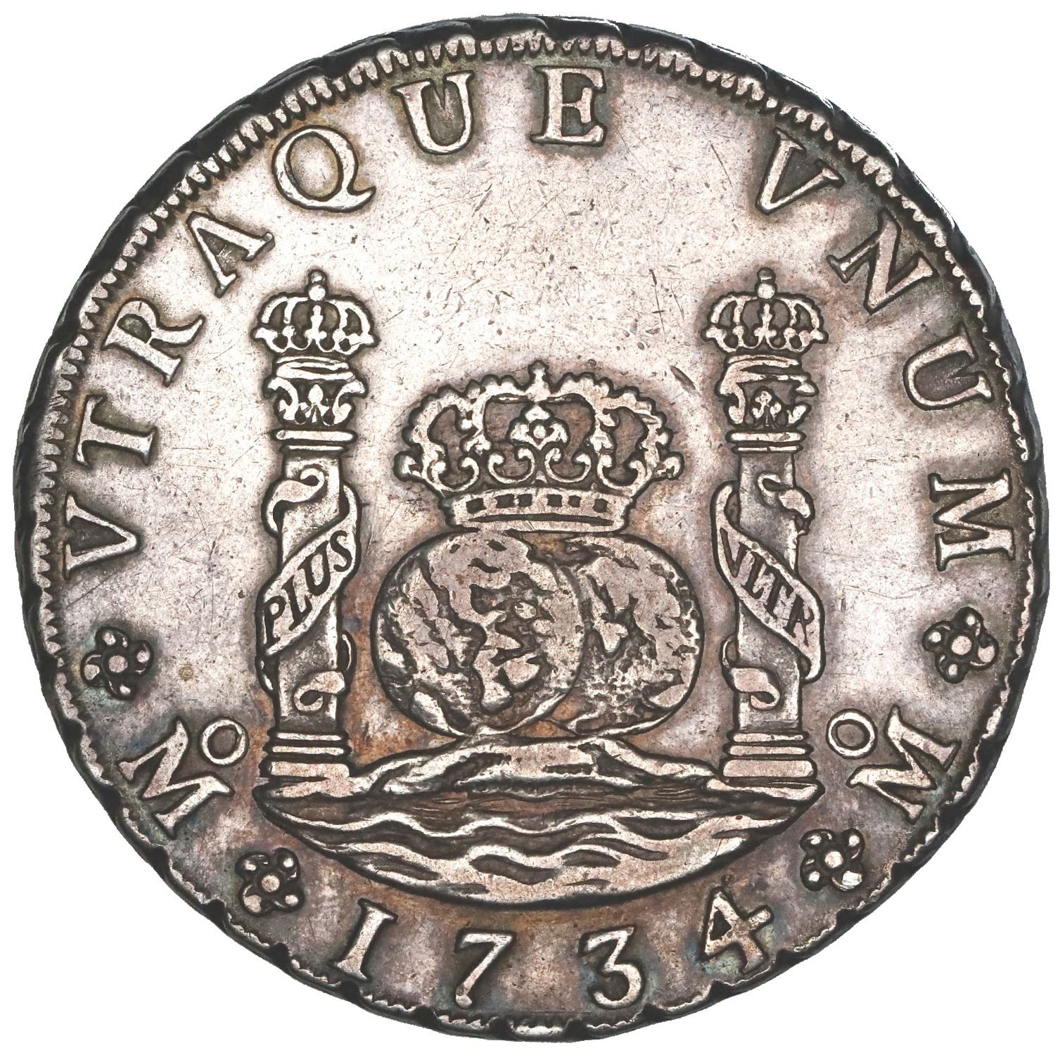 Mexico City, Mexico, pillar 8 reales, Philip V, 1734MF, NGC XF details / cleaned. Cal-1442; KM-103. 26.95 grams. Non-salvage piece with nicely struck XF/AU design elements, light polishing in fields starting to tone over with purple hues. NGC #5934007-001.