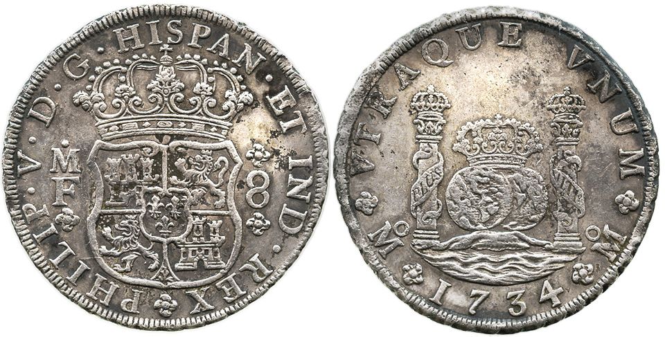 Mexico City, Mexico, pillar 8 reales, Philip V, 1734MF. KM-103; CT-778. 26.8 grams. One hundred percent corrosion-free, with particularly bold rims, well struck, AU details, with light brown toning all over (just a few small dark spots). With certificate from the salvagers. Recovered from: Rooswijk, sunk in 1739 southeast of England