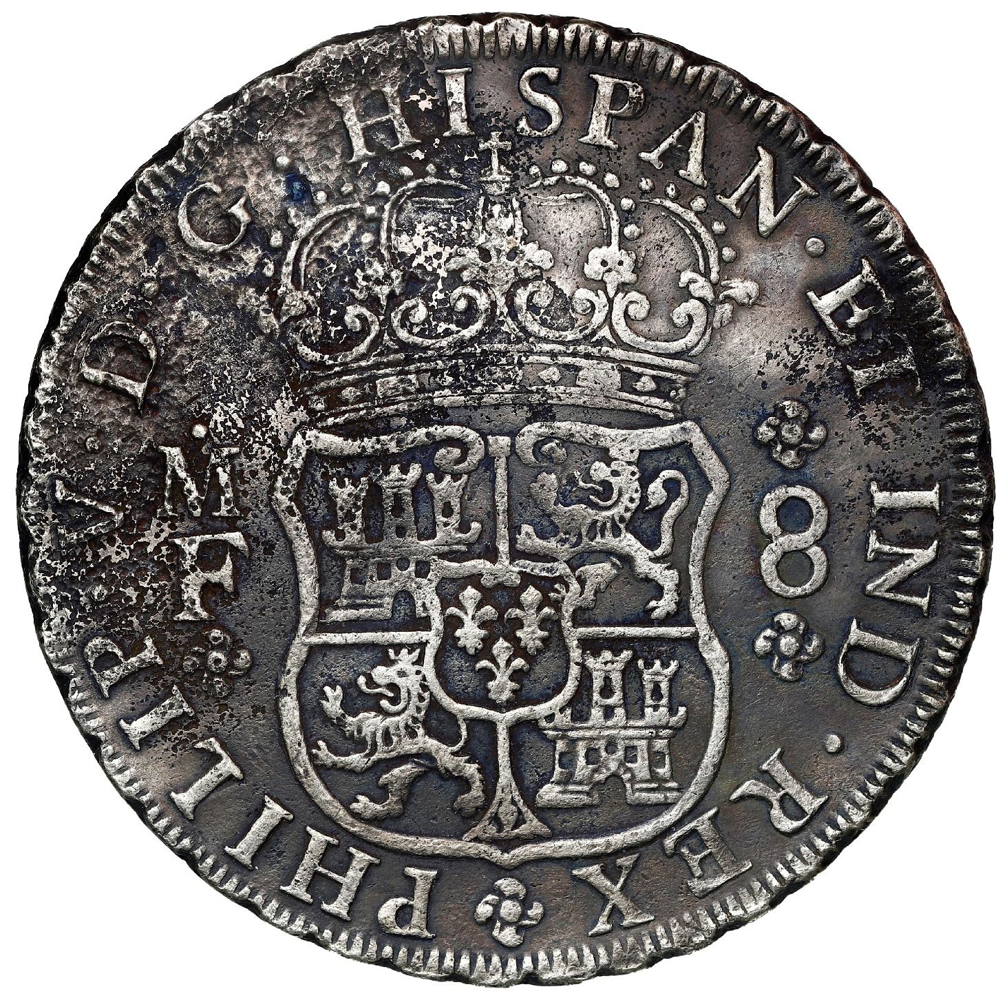 Mexico City, Mexico, pillar 8 reales, Philip V, 1735 MF. KM-103; Cal-1443; Yonaka-M8.35. 26.49 grams. Typically choice AU details with beautiful contrasting toning, mostly corrosion-free but a couple areas of light pitting. Recovered from: Reijgersdaal, sunk in 1747 off South Africa