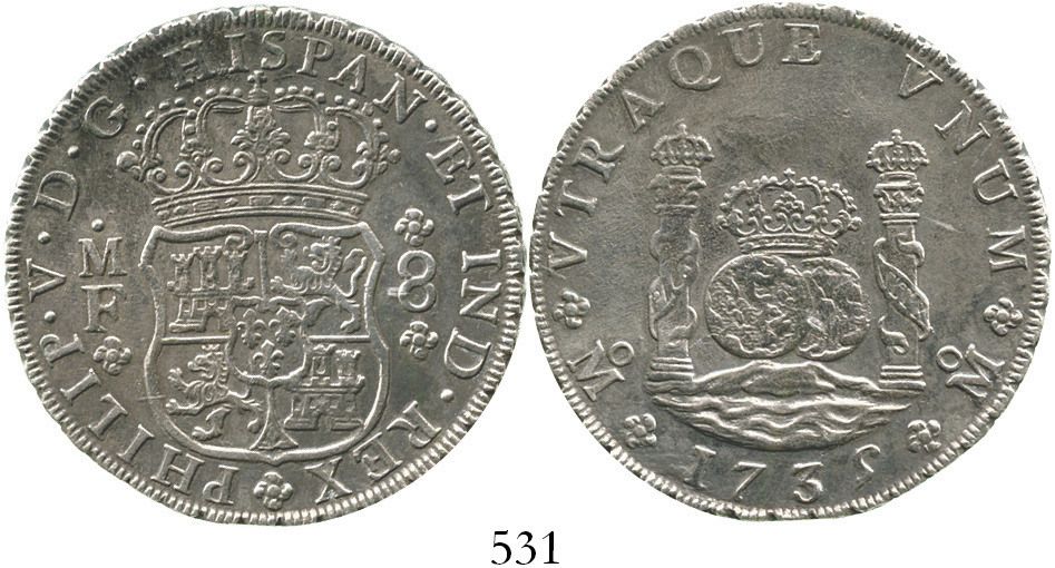 Mexico City, Mexico, pillar 8 reales, Philip V, 1735MF. KM-103; CT-779. 26.3 grams. Bold XF+ details