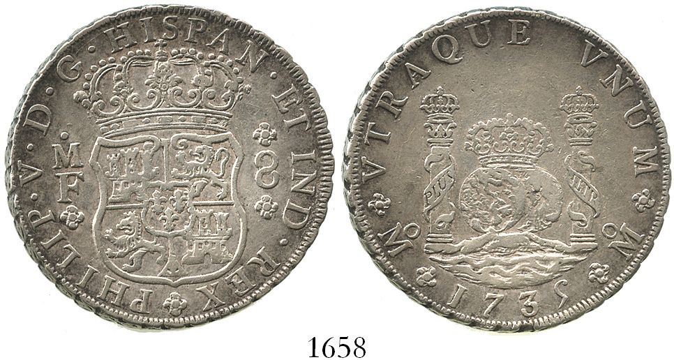 Mexico City, Mexico, pillar 8 reales, Philip V, 1735MF. KM-103; CT-779. 26.7 grams. XF with light toning, no problems, scarce as non-salvage.