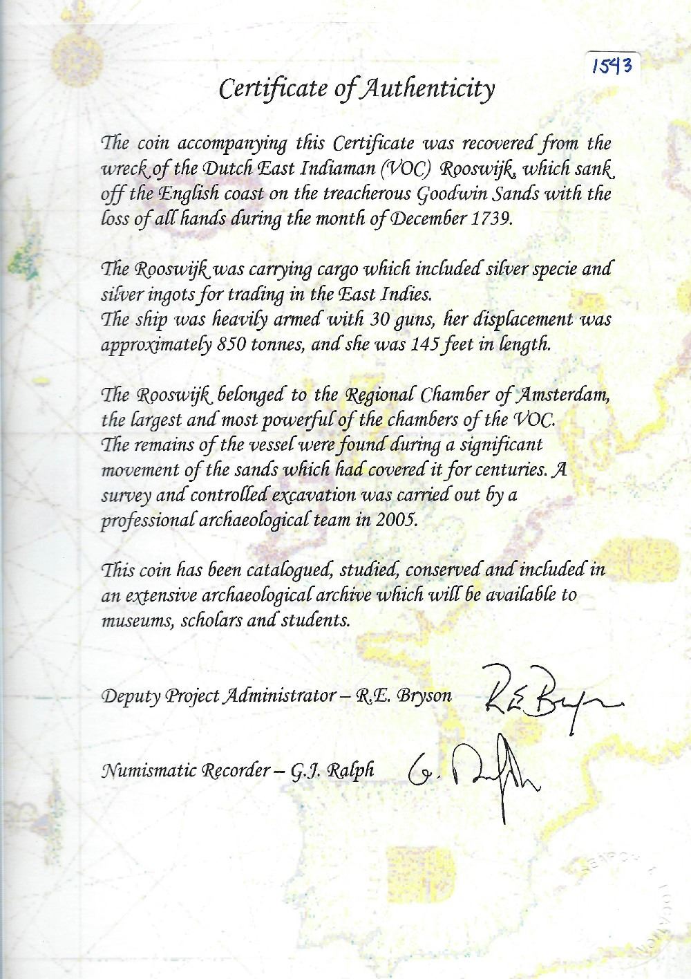 Mexico City, Mexico, pillar 8 reales, Philip V, 1736MF. KM-103; Cal-1445. 25.51 grams. Lightly corroded UNC with spots of amber toning. With original (generic) certificate from the salvors. From: Rooswijk, sunk in 1739 southeast of England
