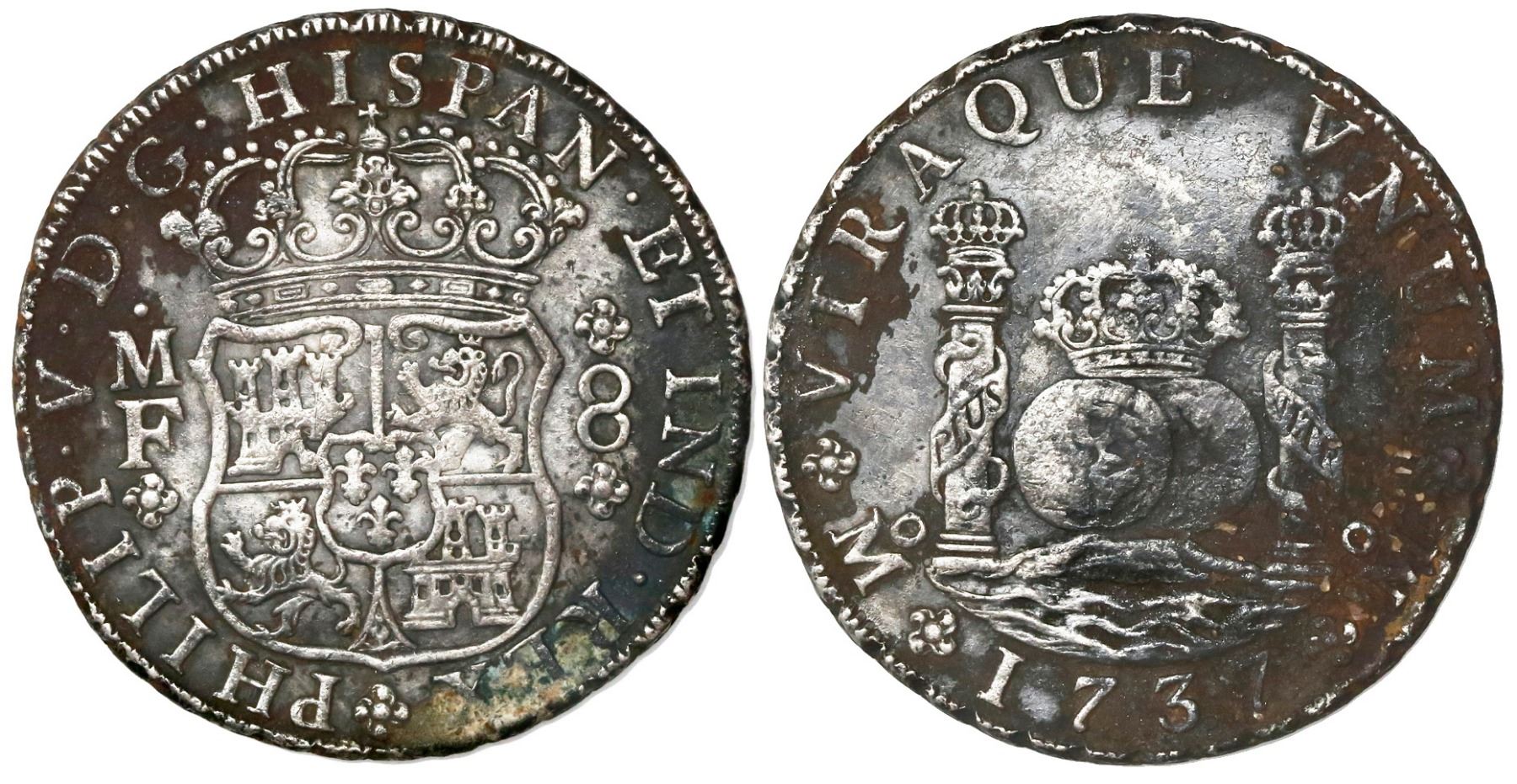 Mexico City, Mexico, pillar 8 reales, Philip V, 1737MF. KM-103; CT-781. 26.76 grams. XF details, no corrosion but with patches of dark orange encrustation, also toned. Recovered from: Rooswijk, sunk in 1739 southeast of England