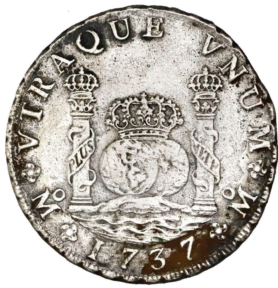 Mexico City, Mexico, pillar 8 reales, Philip V, 1737MF. KM-103; Cal-1446. 24.53 grams. UNC details with lightly surface-corroded pillars side, dark and moderately corroded shield side, spot of dark orange encrustation on date. With original (generic) certificate from the salvagers. Recovered from: Rooswijk, sunk in 1739 southeast of England