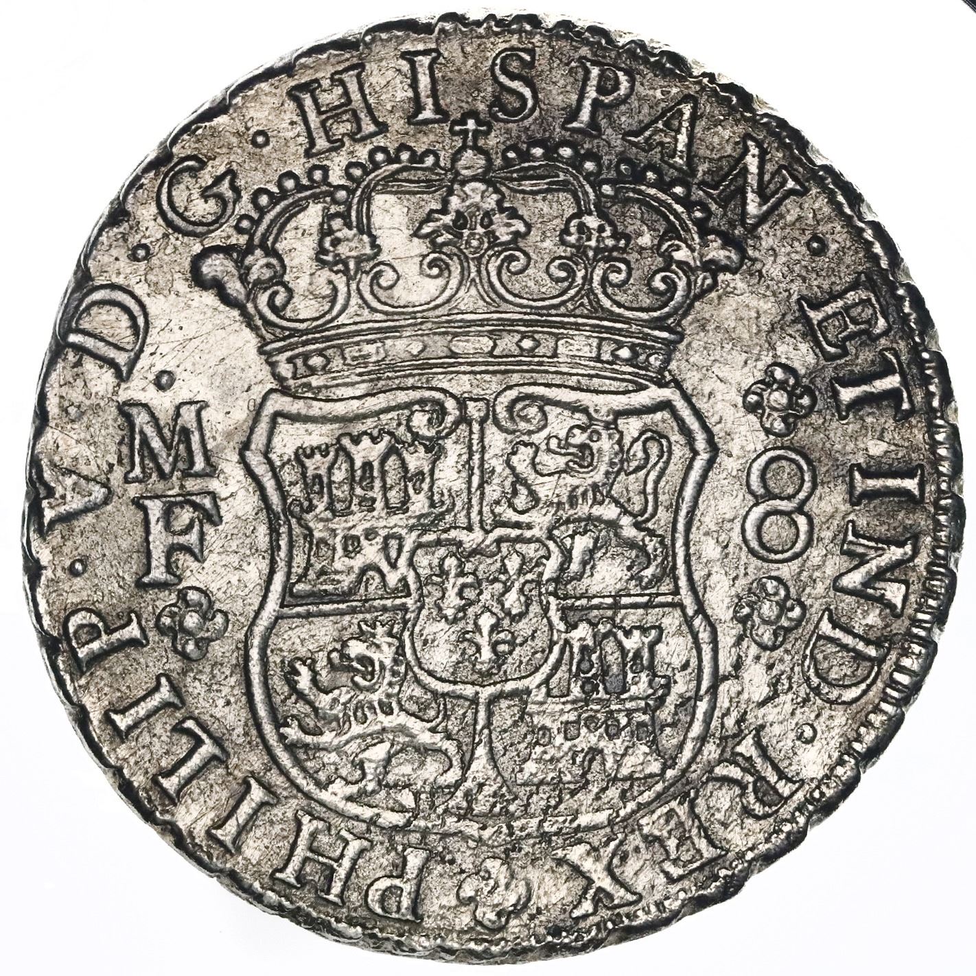 Mexico City, Mexico, pillar 8 reales, Philip V, 1737MF. KM-103; Cal-1446. 25.41 grams. UNC with light surface corrosion, some cleaning marks in the fields. With original (generic) certificate from the salvors. From: Rooswijk, sunk in 1739 southeast of England