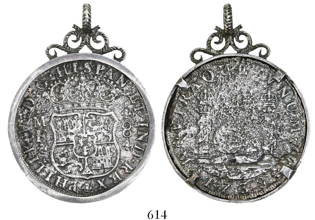 Mexico City, Mexico, pillar 8 reales, Philip V, 1738MF, mounted in sterling silver bezel (supposedly made from silver salvaged from the wreck in the 1970s). KM-103; CT-783. 30.00 grams total. Heavily corroded but with all details still clear, the mounting very simple but with fancy bale at top. With generic certificate from the salvagers. Recovered from: Hollandia, sunk in 1743 off the Scilly Isles, southwest of England