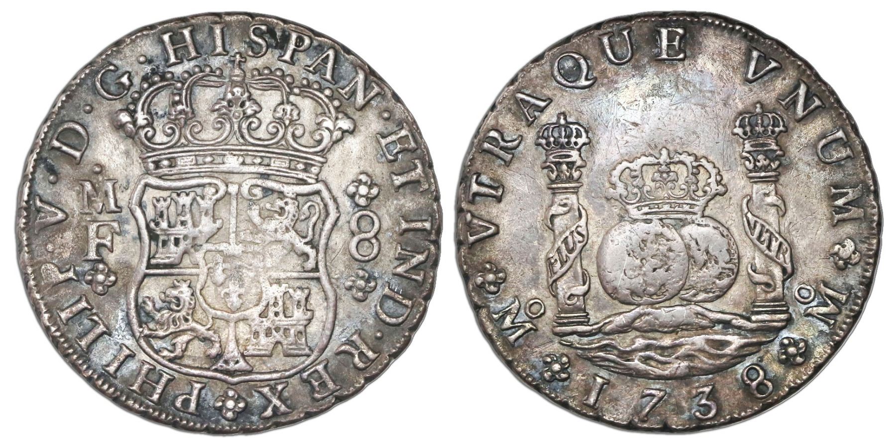 Mexico City, Mexico, pillar 8 reales, Philip V, 1738MF. KM-103; CT-783. 26.05 grams. Richly toned XF, decidedly non-salvage (scarce thus) but with traces of surface porosity on shield side.