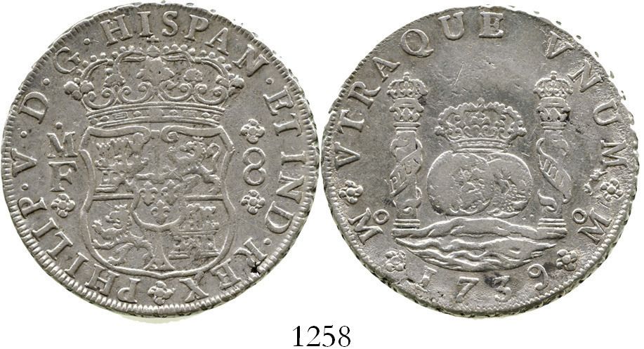 Mexico City, Mexico, pillar 8 reales, Philip V, 1739MF. KM-103; CT-787. 26.7 grams. Lightly cleaned AXF, slight flan-bulge above worlds, scarce as non-salvage.