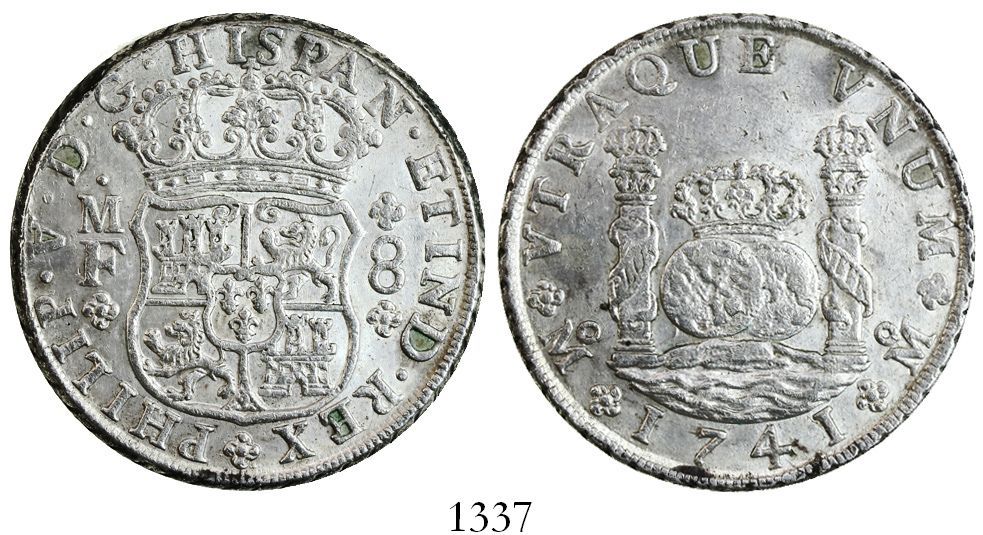 Mexico City, Mexico, pillar 8 reales, Philip V, 1741MF. KM-103; CT-791. 27.14 grams. Bold, non-salvage Mint State with bagmarks in fields, no toning, muted luster.