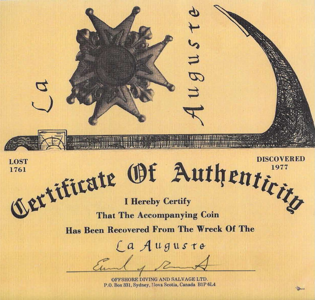 Mexico City, Mexico, pillar 8 reales, Philip V, 1743 MF. KM-103; Cal-1463; Yonaka-M8.43. 25.67 grams. XF details with light surface corrosion, patches of dark encrustation here and there, two minor rim-flaws on pillars side. With original (generic) certificate from the salvor. Recovered from: La Auguste, sunk in 1761 off Nova Scotia, Canada