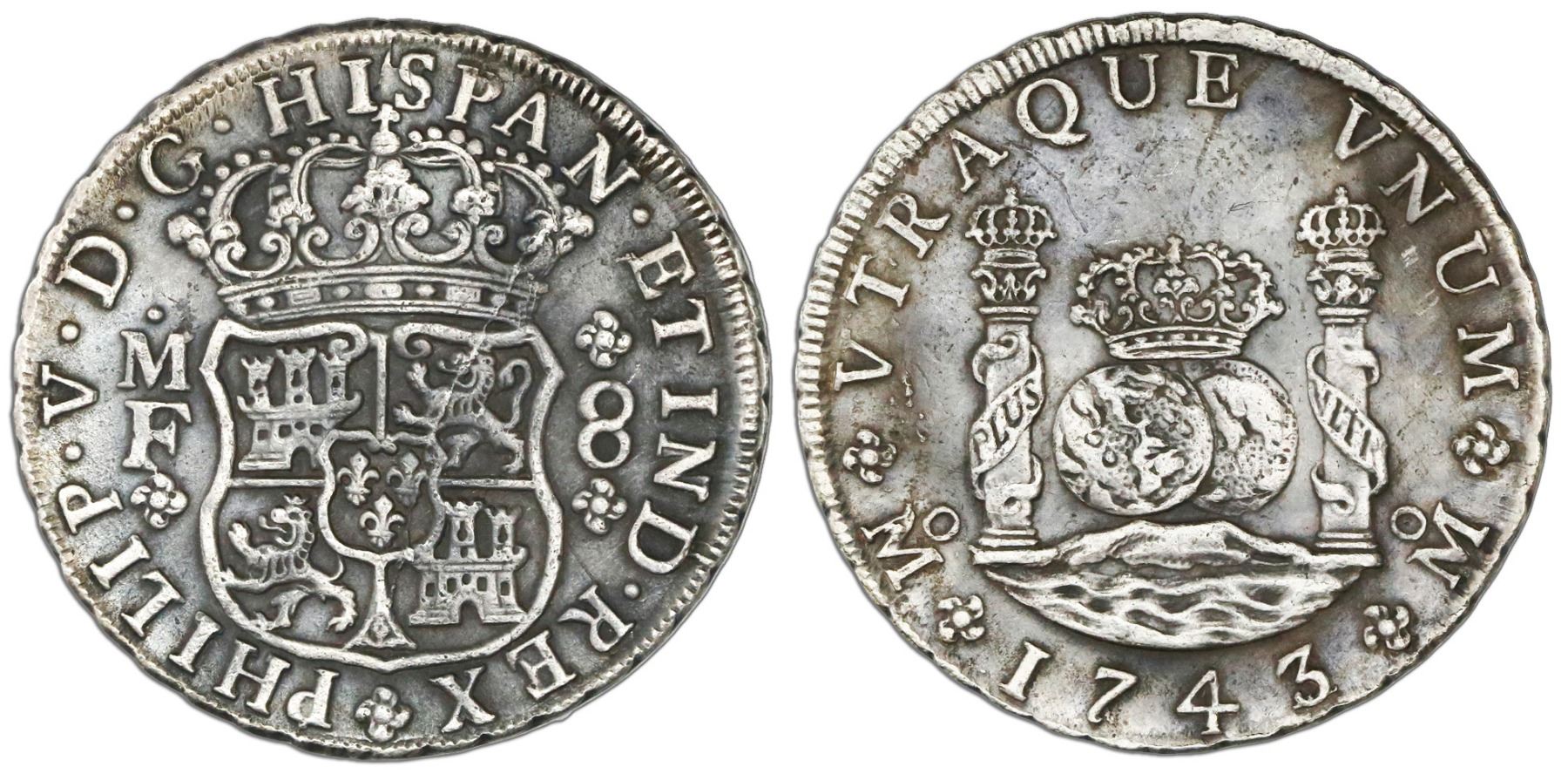 Mexico City, Mexico, pillar 8 reales, Philip V, 1743MF. KM-103; CT-795. 26.48 grams. Choice AU+ with light toning, no corrosion, slightly off-center strike. Pedigreed to the Stack's Bowers & Ponterio auction of November 2011, with original lot-tag #20119. Recovered from: Reijgersdaal, sunk in 1747 off South Africa