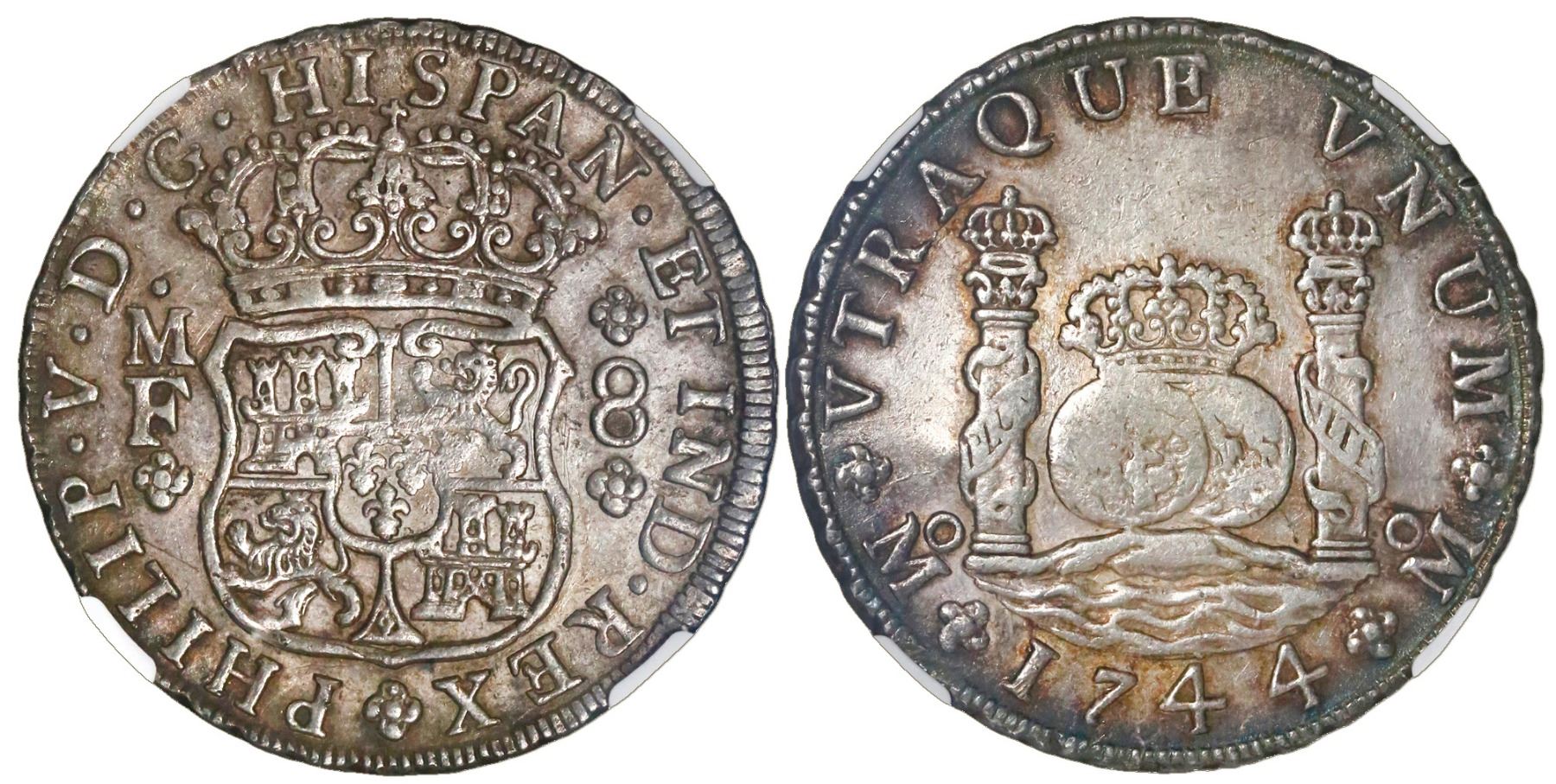 Mexico City, Mexico, pillar 8 reales, Philip V, 1744MF, NGC AU 55. KM-103; CT-797. Weakly struck centers, colorful toning at pillars-side rim. NGC #4460456-130.