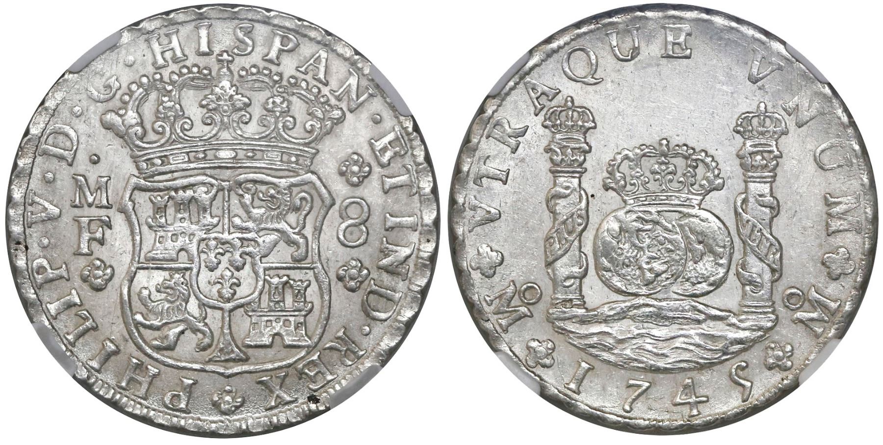 Mexico City, Mexico, pillar 8 reales, Philip V, 1745MF, NGC MS 61.