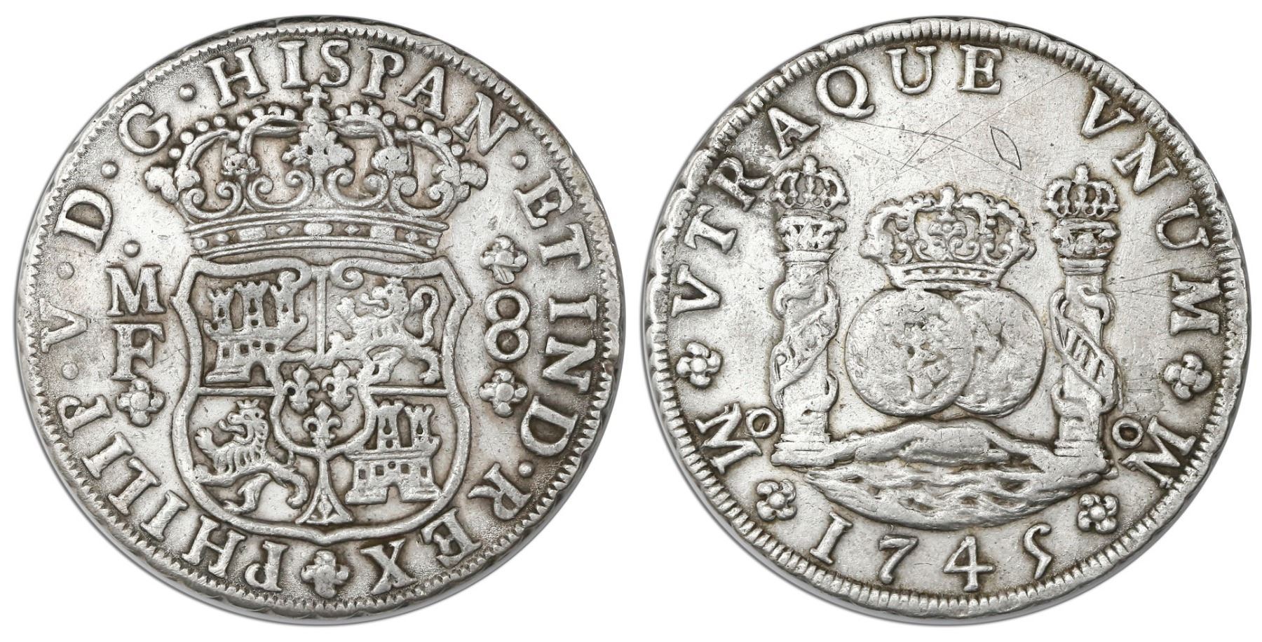 Mexico City, Mexico, pillar 8 reales, Philip V, 1745MF. KM-103; CT-798. 26.88 grams. Bold AXF, lightly cleaned, with minor scratches below QUE. Pedigreed to the Cayon auction of February 2012, with original lot-tag #592.