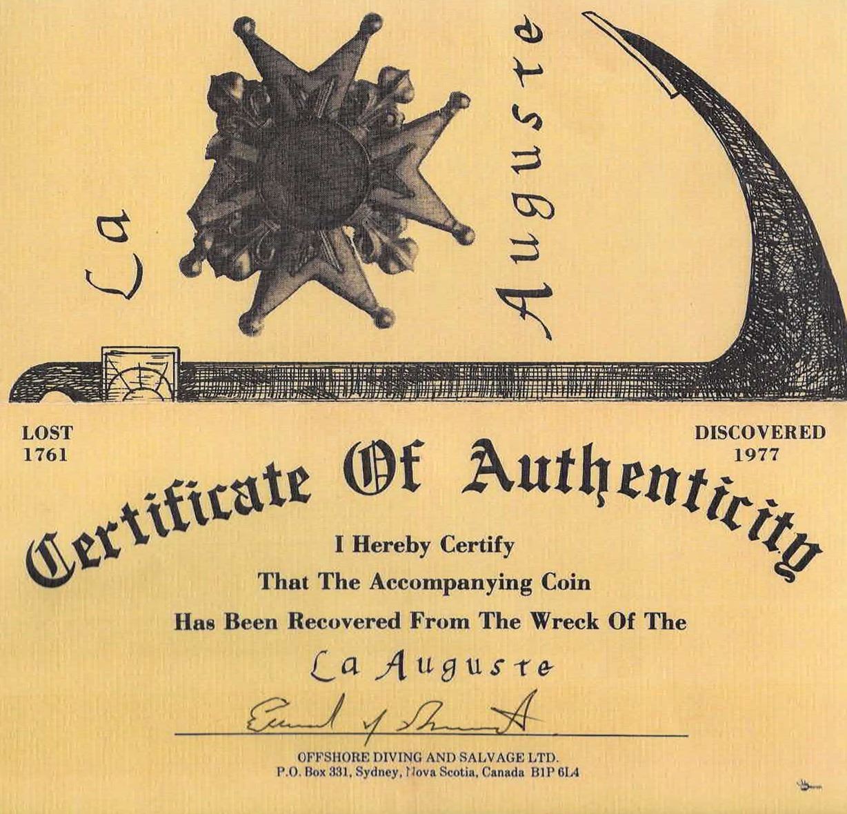 Mexico City, Mexico, pillar 8 reales, Philip V (posthumous), 1747 MF. KM-103; Cal-1472; Yonaka-M8.47. 20.94 grams. XF with moderate corrosion (especially on pillar side), areas of dark oxidation on shield side. With original (generic) certificate from the salvor. Recovered from: La Auguste, sunk in 1761 off Nova Scotia, Canada