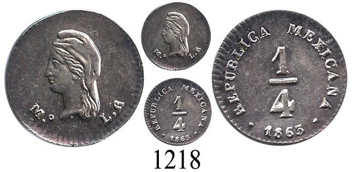 Mexico City, Mexico, ¼ real, 1863/53LR. KM-368.6. 0.8 gram. Gem BU, lustrous and lightly toned.