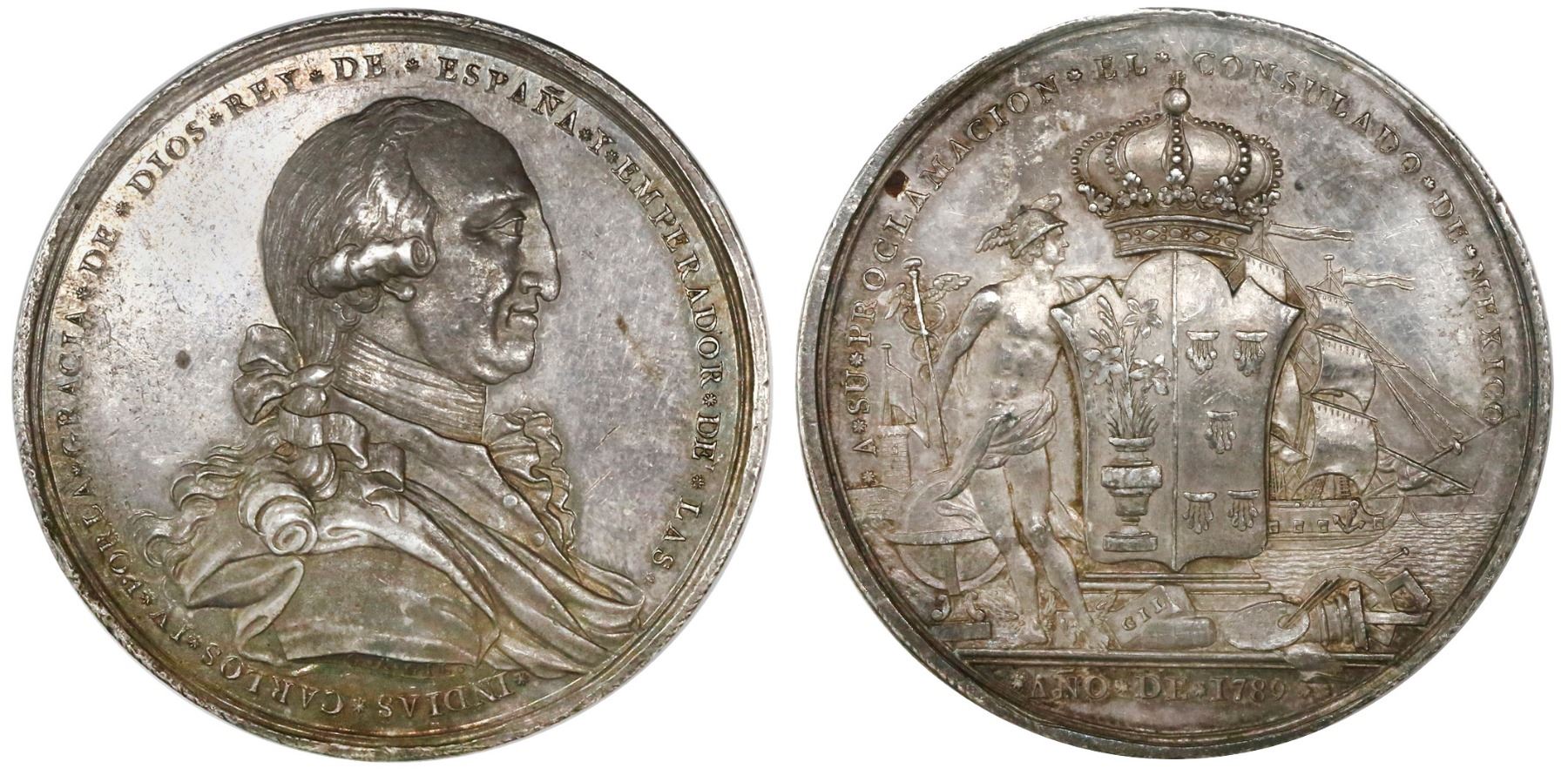 Mexico City, Mexico, silver proclamation medal, Charles IV, 1789, Mexico City Consulate, NGC MS 61.