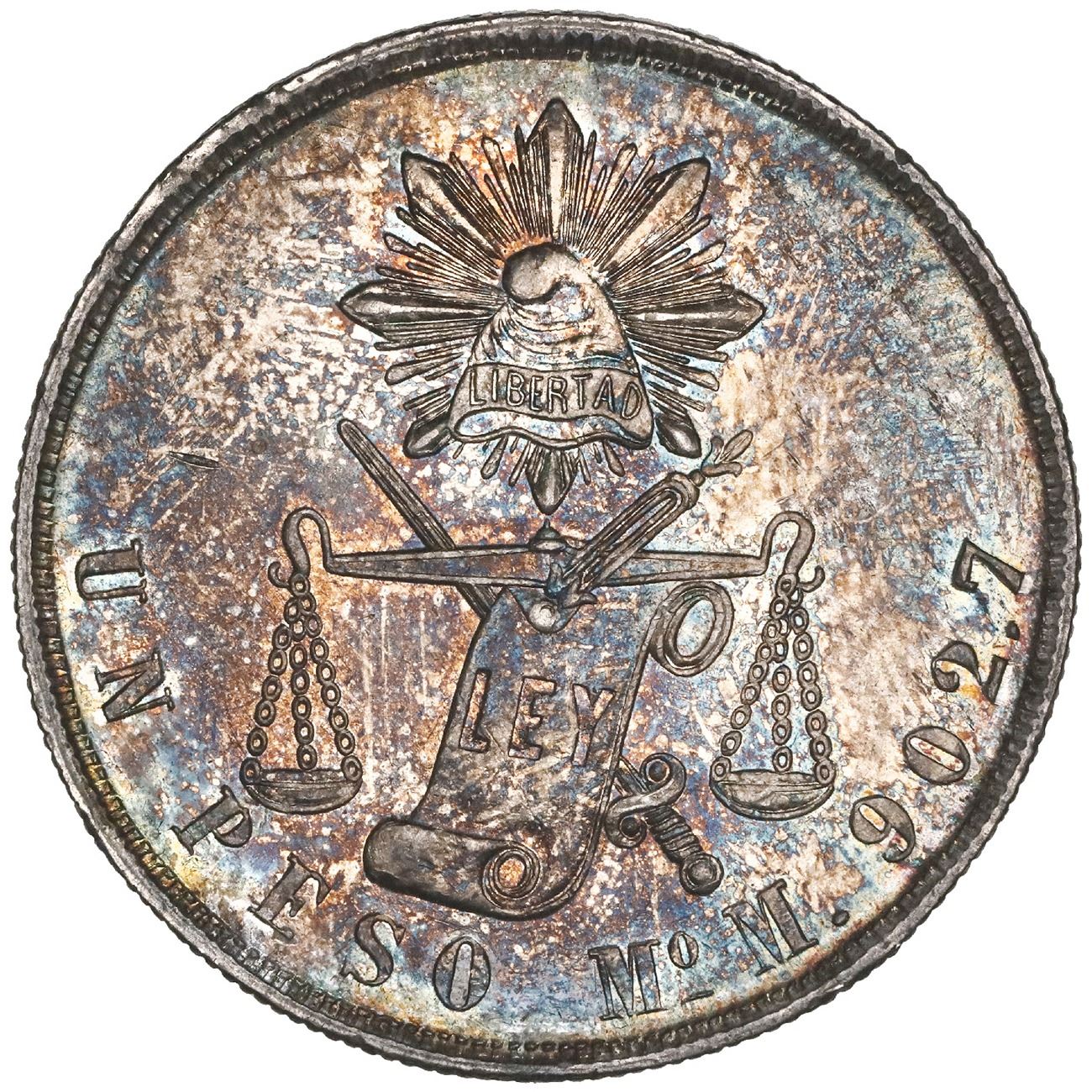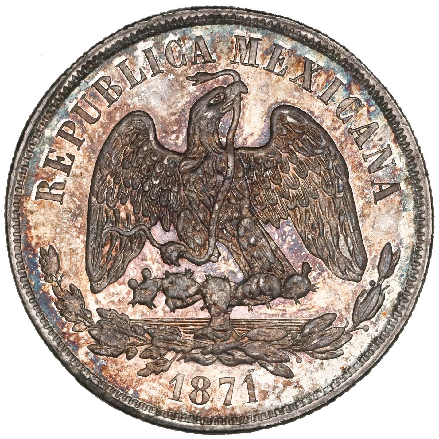 Mexico City, balance-scale peso, 1871M, NGC MS 62. KM-408.5. Choice luster splashed with vibrant rainbow toning, light marks but no wear, quite pretty. NGC #5938099-001.