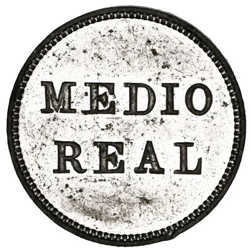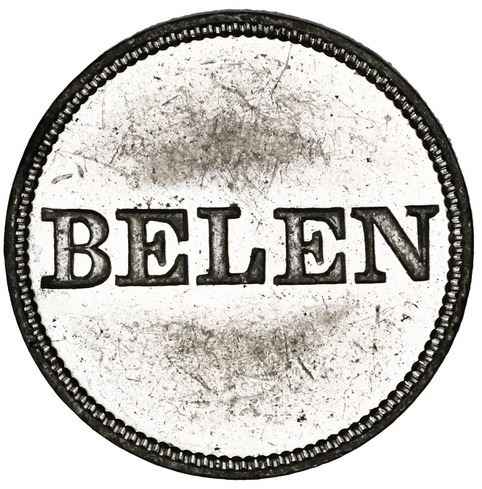 Mexico(?), aluminum 1/2 real token, Hacienda Belen, made by Scovill Mfg. Co. (late 1800s). Rulau-unl (cf. Mex84). 3.68 grams; 19.5mm. Obverse with BELEN; reverse with MEDIO. Lustrous UNC with only tiny marks, incipient toning around details, thick flan (piefort?), same as Rulau-Mex84 but with MEDIO instead of 3/4, the latter listed in Rulau under "Unattributed Mexico" but with explanation (on p. 144) that these have been variously attributed to Cuba and Guatemala as well.