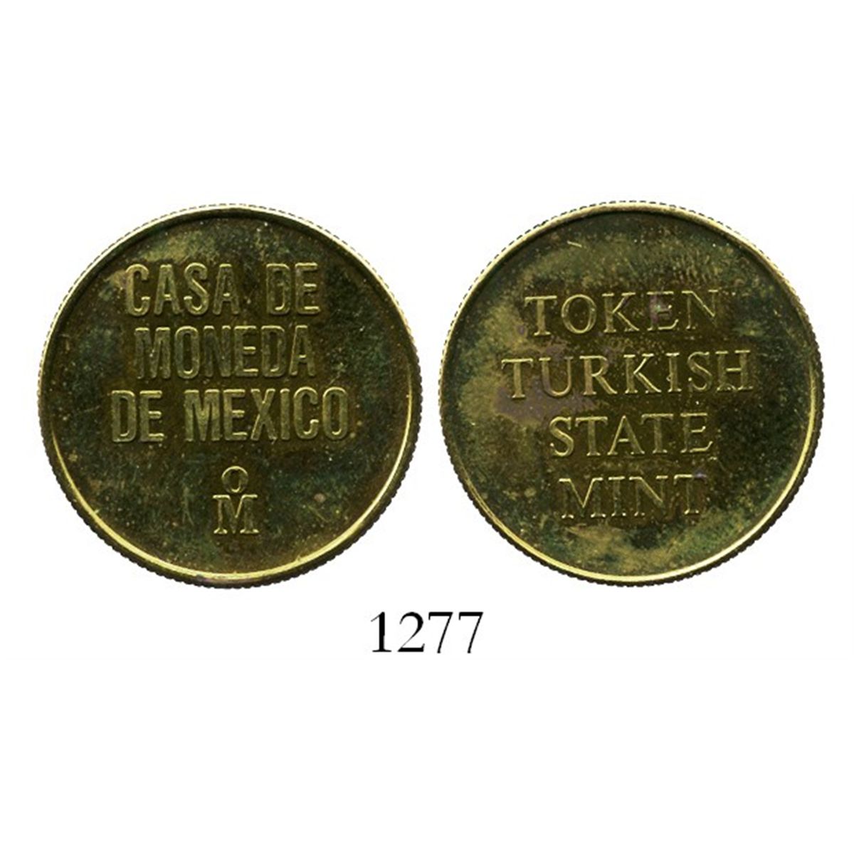 Mexico, brass mint-trial token for Turkish 100 kurus (ca.1980) struck at the Mexico City mint. 6.2 grams. Lustrous Mint State, with reeded edge and simple wording inside indicating that this was struck by the Mexican mint for the Turkish State mint on a sample flan in brass but designed for bullion gold coins.