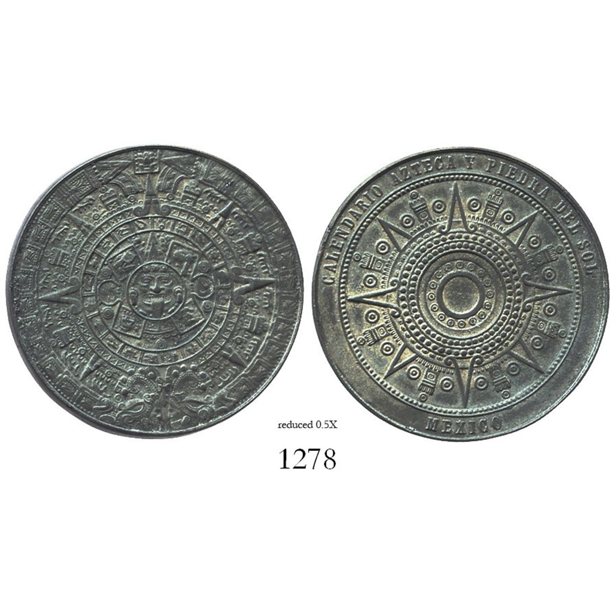 Mexico, white-metal (pewter?) medal of the Mayan calendar with Spanish/English interpretation sheet. 93.9 grams, 2-3/4" in diameter. An antique souvenir (shows some age, but date of manufacture unknown) with Mayan calendar on one side and CALENDARIO AZTECA Y PIEDRA DEL SOL / MEXICO on the other around decorative design, somewhat dark and lightly oxidized but no worse than VF for wear, currently popular for what some believe is the calendar's dire prediction of the end of the world on December 21, 2012 (we shall see...).