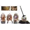 Miller-Dunn 3 brass dive helmet (ca. 1945) with original hose and handled pump. Helmet 58 lb, 25" tall and 12" in diameter; pump 55 lb, 17" x 9" x 24" with 3' handle. It is gut-wrenching to look at this contraption and imagine divers risking their lives underwater, completely entrusting a topside assistant to keep pumping the handle! Rumored to be Art McKee's instrument of choice, it consists of a tall, copper-colored helmet with large rectangular front window and two small round sidelights, handle at top, lead plates on front and back of the shoulders, with hose bib on side for connecting the long black hose that leads up to the 2-chamber pump mounted on a wooden box with iron handle with wooden grip, all in excellent condition for its age, not something we would recommend using, of course, but very impressive as a display on antique diving history.