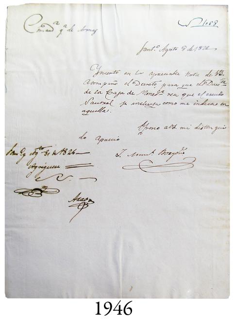 Mint document from 1826 from Santiago, Chile. 8-1/8" x 11-3/4". Brief, one-page letter (notated as an amendment to a larger document) in choice condition dated August 8, 1826, asking the director of the mint to check the decree to make sure the coat-of-arms is correctly executed, signed by Juan Manuel de Borgoña(?).