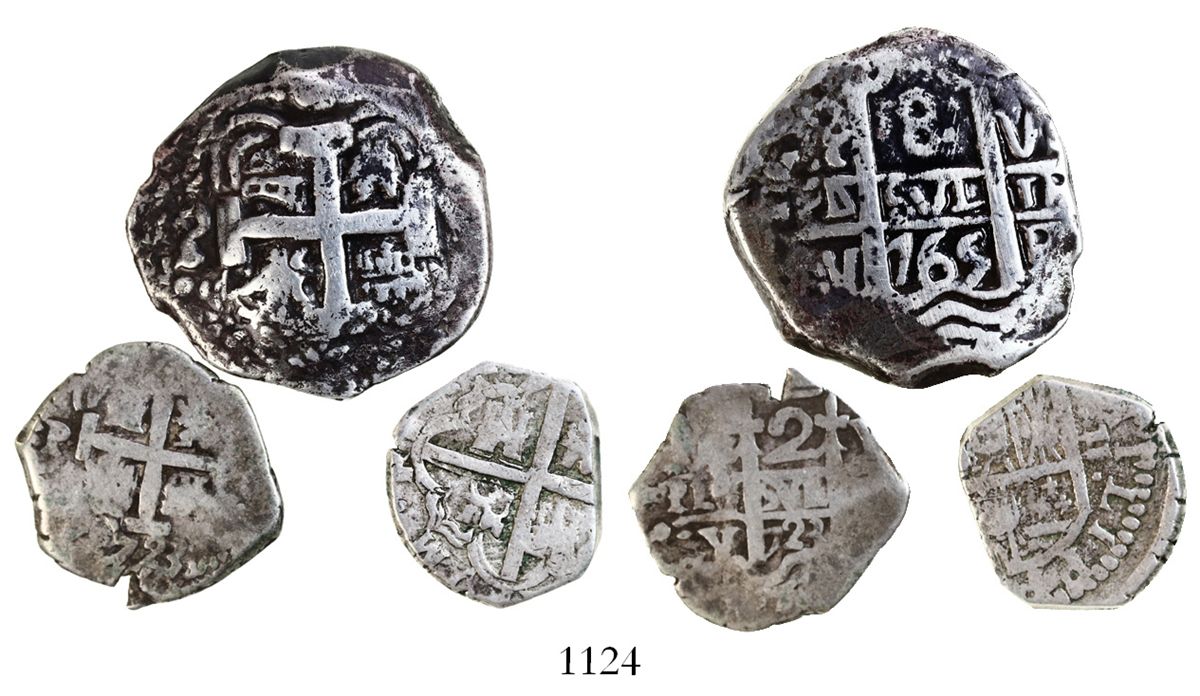Mixed lot of 3 silver cobs: Potosi, 8R, 1765V-Y; Potosi, 2R, 1723Y; and Spain (mint uncertain), 2R, Philip III or IV. 35.41 grams total. F-VF with generally good toning (the toning on the 8R shiny black), good crosses and other details.