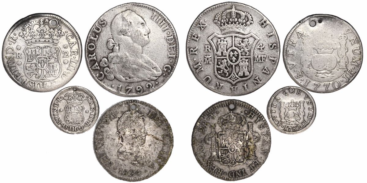 Mixed lot of 4 Spanish and Spanish colonial minors (pillars and busts): 4R Madrid 1792MF; 2R Potosi 1770JR; 2R Cuzco 1824T; and 1/2R Potosi 1769JR. 27.46 grams. Fine on average, all but the 4R holed, the Cuzco with light surface porosity, minimal toning.