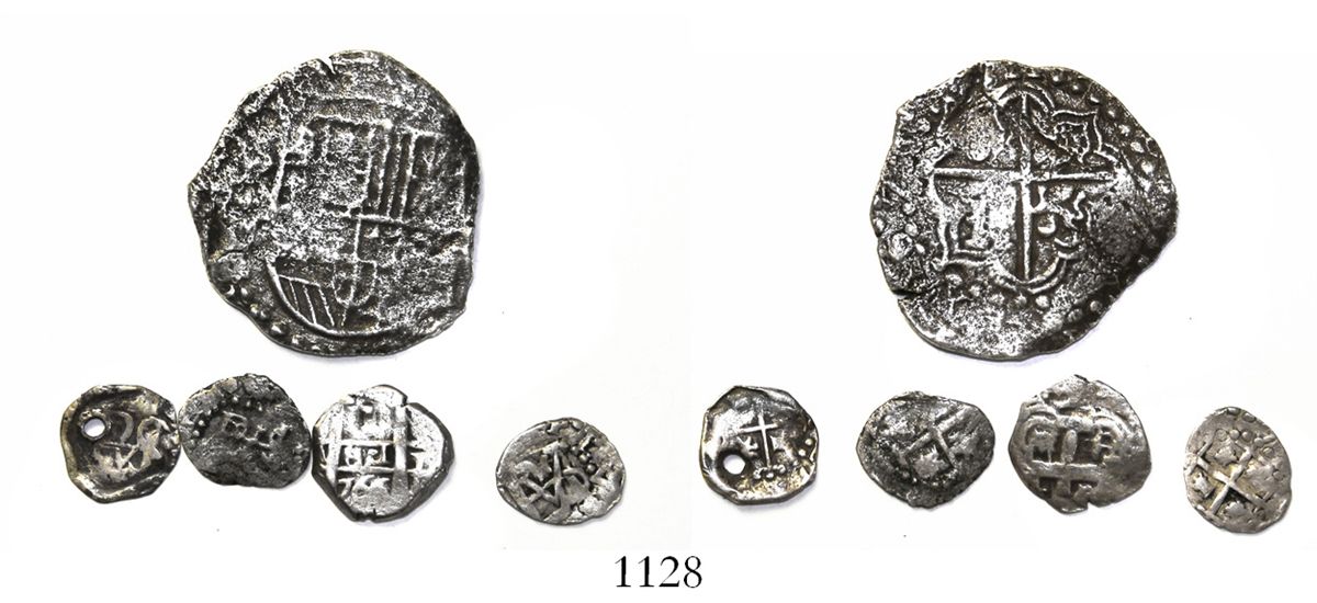 Mixed lot of 5 miscellaneous silver cobs: Potosi 8R 1620?T; Potosi 1/2R Philip IV no assayer (2); Potosi 1R 1766(V-Y); and Lima 1/2R Philip V. 25.97 grams total. The 8R is salvaged but nicely toned and with bold details; the small cobs are decent Fine or so, one with big hole, mostly toned.