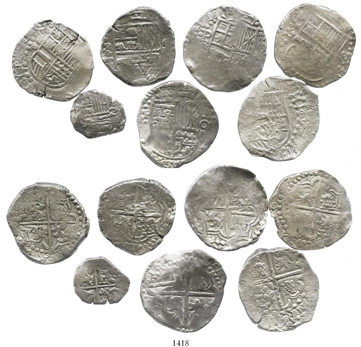Mixed lot of 7 Potosi, Bolivia, cobs of Philip III and IV: six 8R (assayers curved-leg R, T, P and not visible, some with partial dates; and one 2R. 160.8 grams total. Generally full crosses and shields, F-VF on average, no corrosion but lightly cleaned to look like Atocha coins.