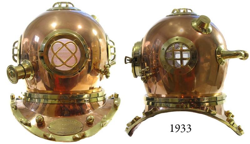 Modern replica of a U.S. Navy Schrader "Mark V" bronze diving helmet. 19 lb, 15" tall and 12" in diameter. In highly polished copper and brass, this is plainly not an original but is an exact replica, with small windows in front and on sides and on top, 2 air intake nozzles in back and vent in front, complete with breastplate showing a plaque that says NAVY DIVING HELMET / MARK V MOD-1, an awesome conversation piece that would be worth thousands of dollars if it were an original, even the replica seen online selling for upwards of $1000.