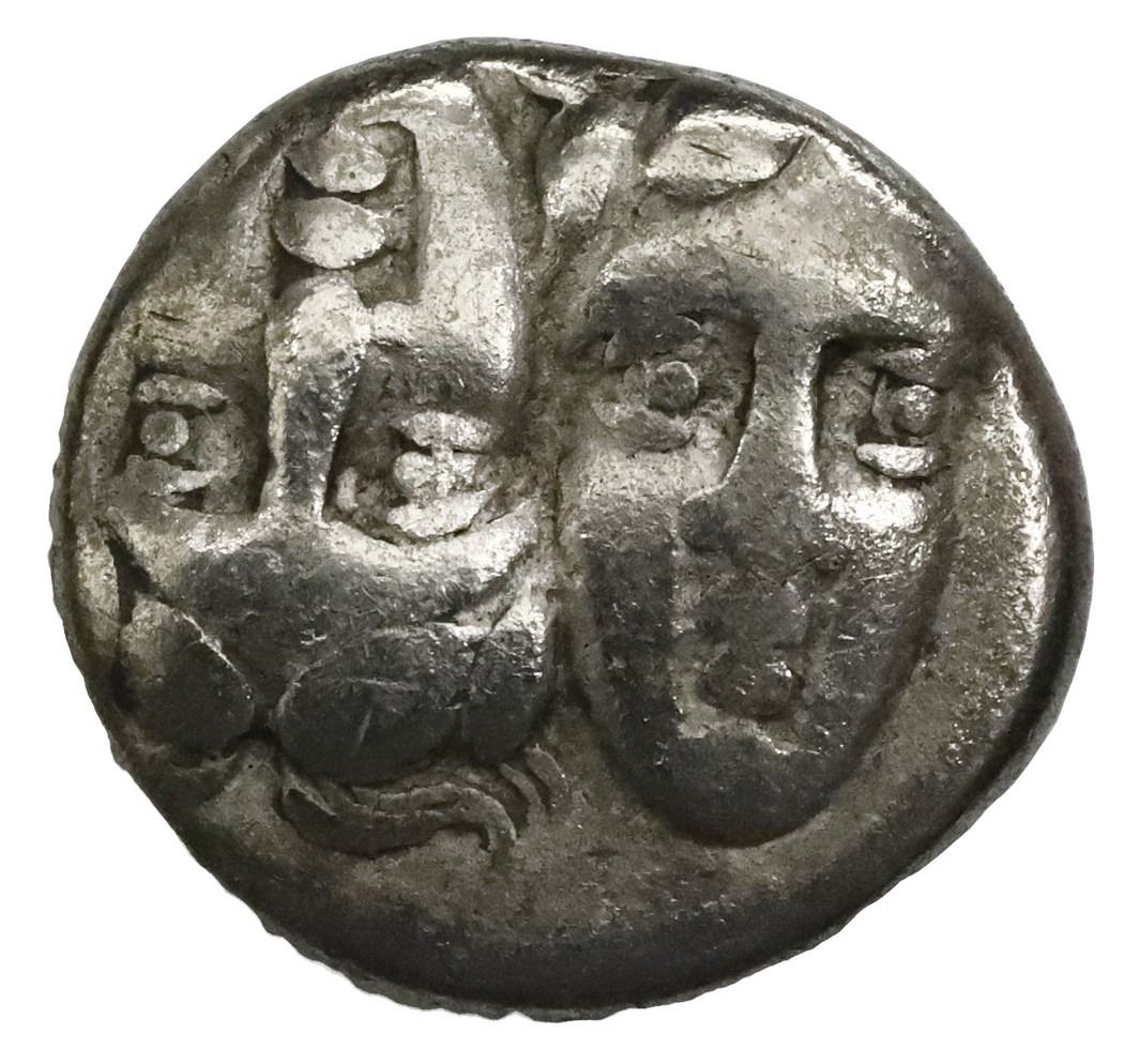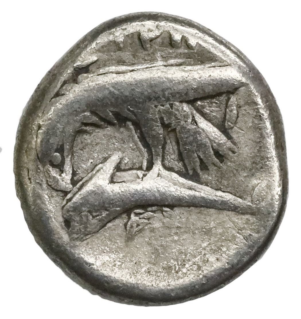 Moesia, Istros, AR stater, ca. 400 BC. 4.10 grams. Facing male heads, the left inverted / Sea-eagle grasping dolphin; ISTRIH above. Fine with soft details.