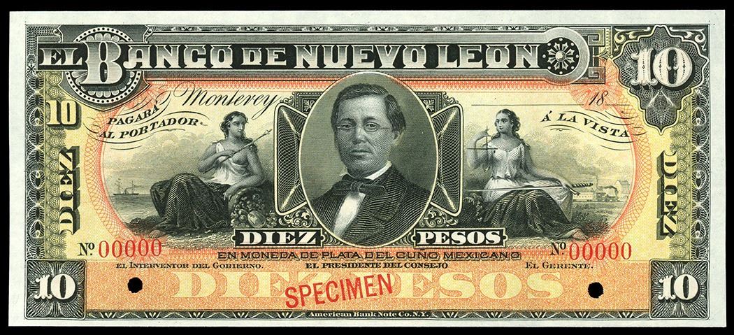 Monterrey, Mexico, Banco de Nuevo Leon, 10 pesos specimen, 18XX (1895-1913). Frampton-M435s; SCWPM-S361s. Two POCs. Colorful UNC, good margins, with some original paper wave.