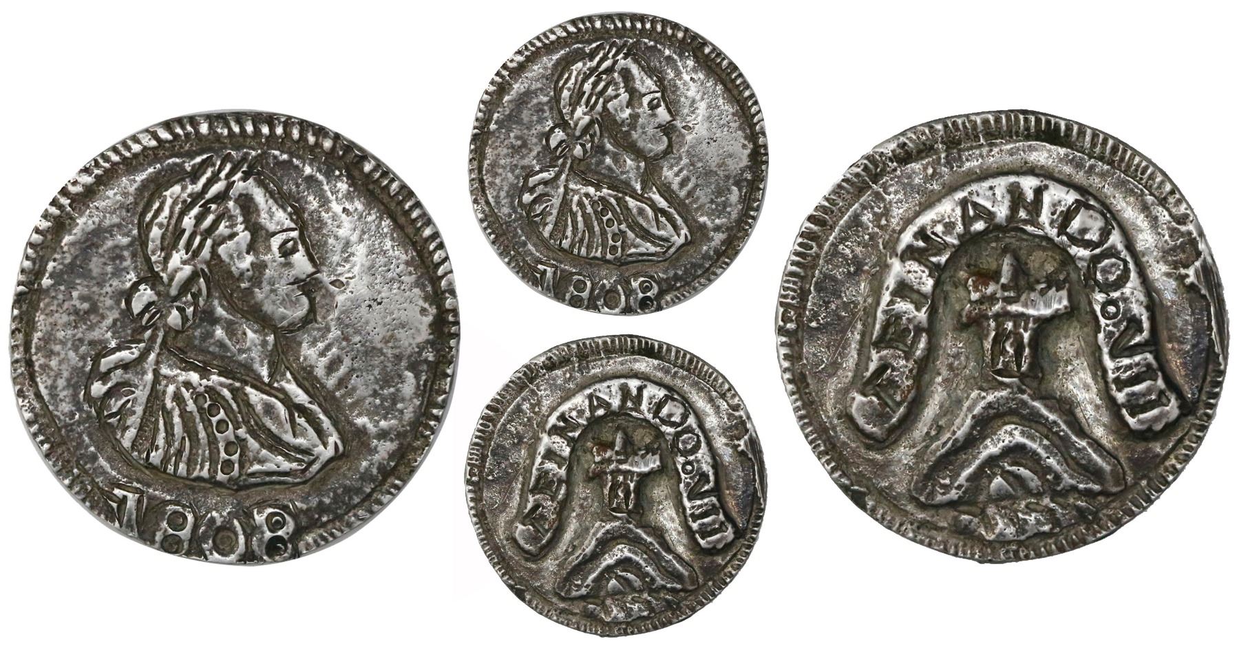 Montevideo, Uruguay, cast silver proclamation medal, Ferdinand VII (bust of Charles IV), 1808. Medina-325. 9.97 grams; 28 mm The first of three designs in the 1808 Montevideo proclamation series. Bust of Charles IV (representing Ferdinand VII) with 1808 on obverse, reverse with banner reading FERNANDO. VII above castle. AU with typical crude strike, scrape along rim on reverse at 3 o'clock and a scratch to left of banner, green toning throughout with minor verdigris around castle, some spots of original silver color. Very scarce piece with no recent auction appearances.