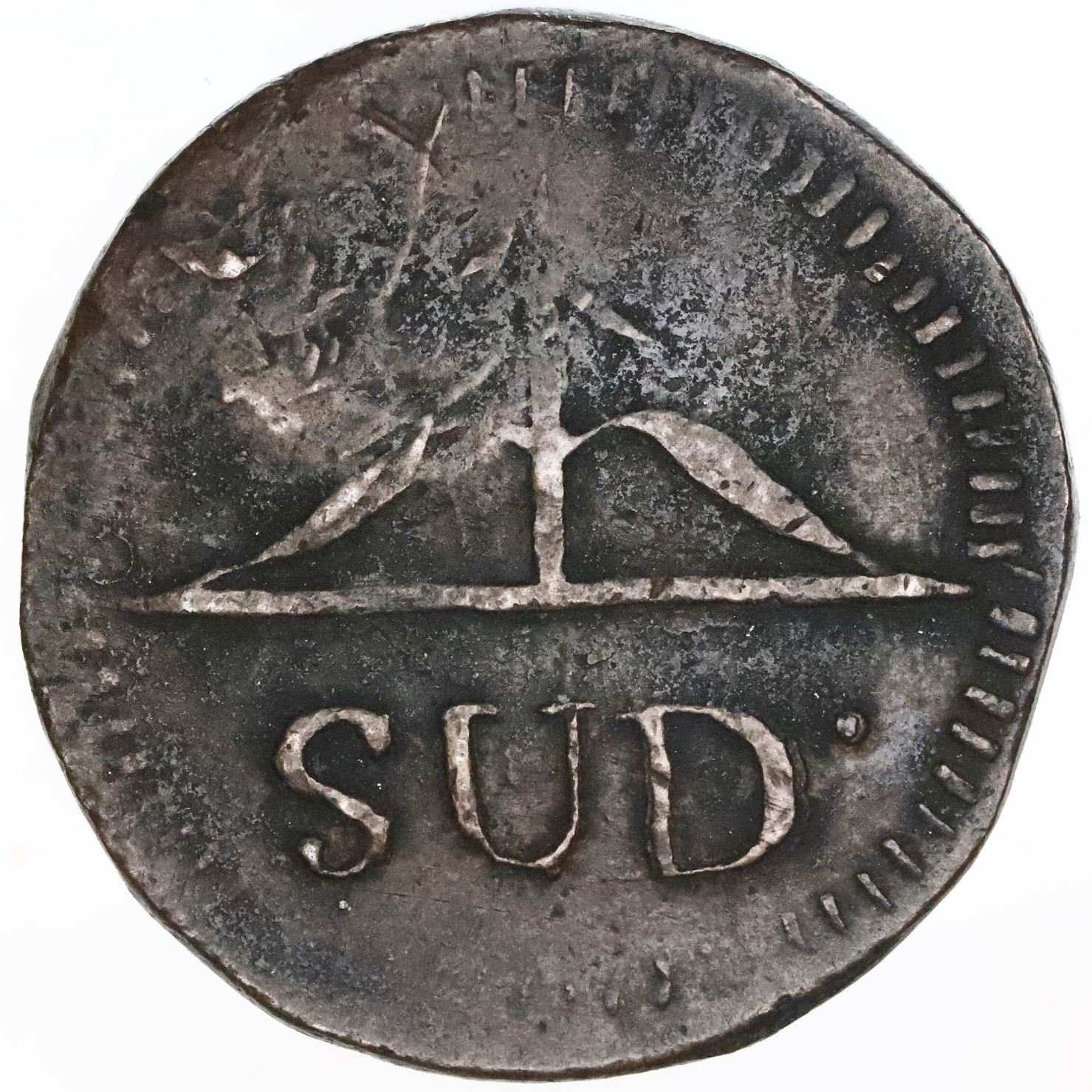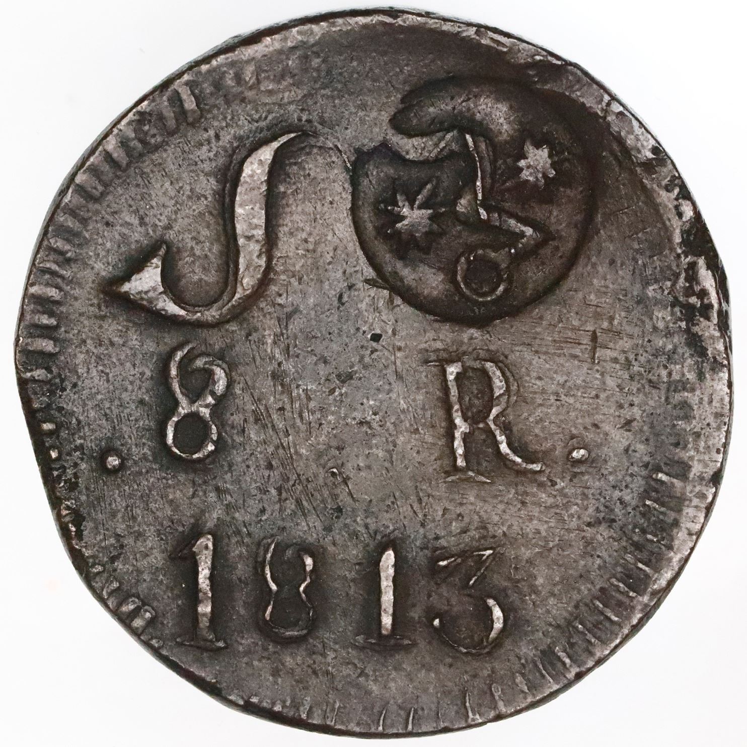 Morelos (Type A) countermark on a Oaxaca (Morelos/SUD), Mexico, copper 8 reales, 1813, NGC XF 45 BN.